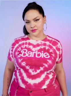Think pink with Barbie! Step out into Malibu with the perfect baby tee on, featuring a hot pink & white tie-dye pattern in the shape of a heart, and the Barbie logo printed at the center.