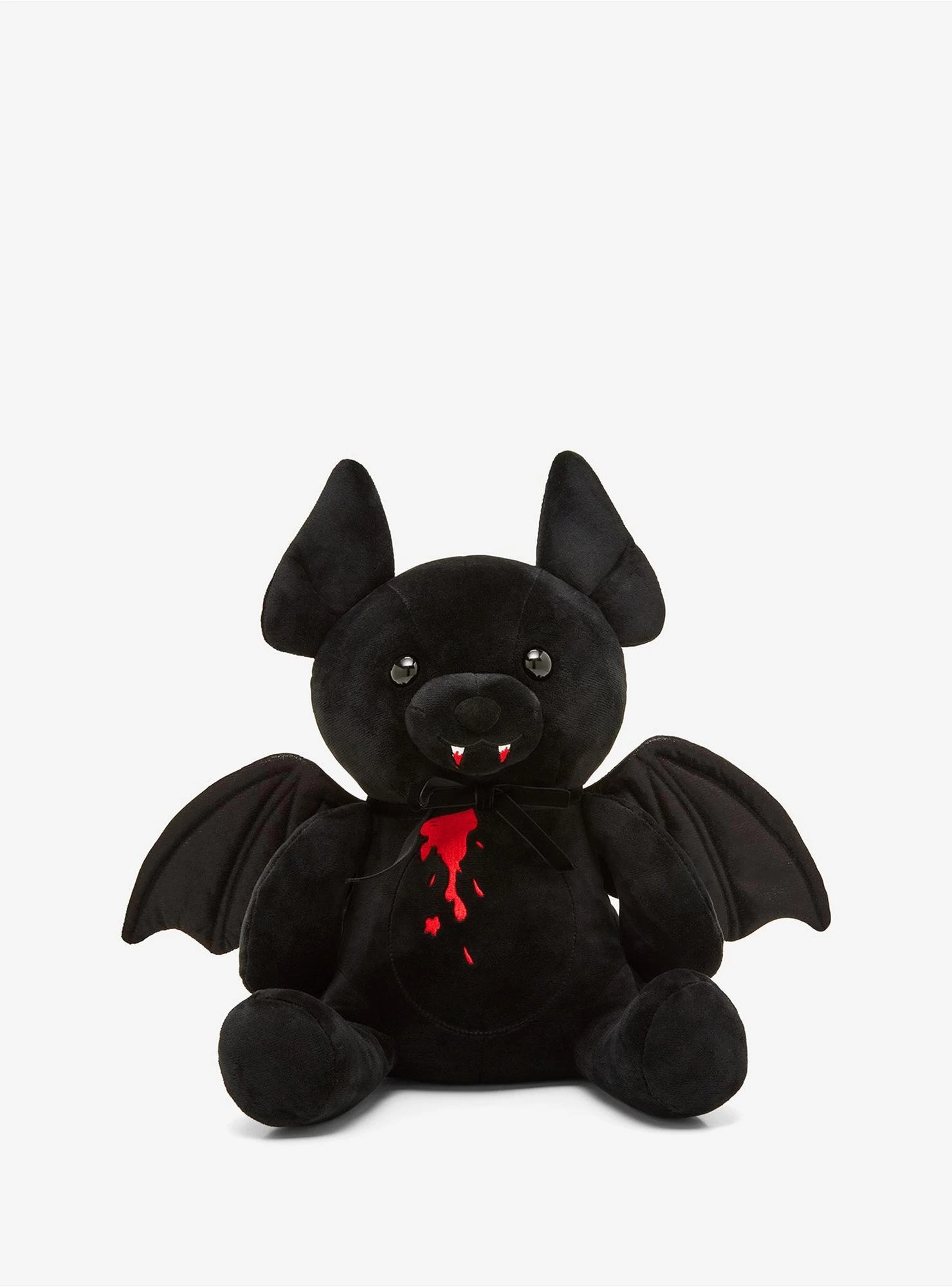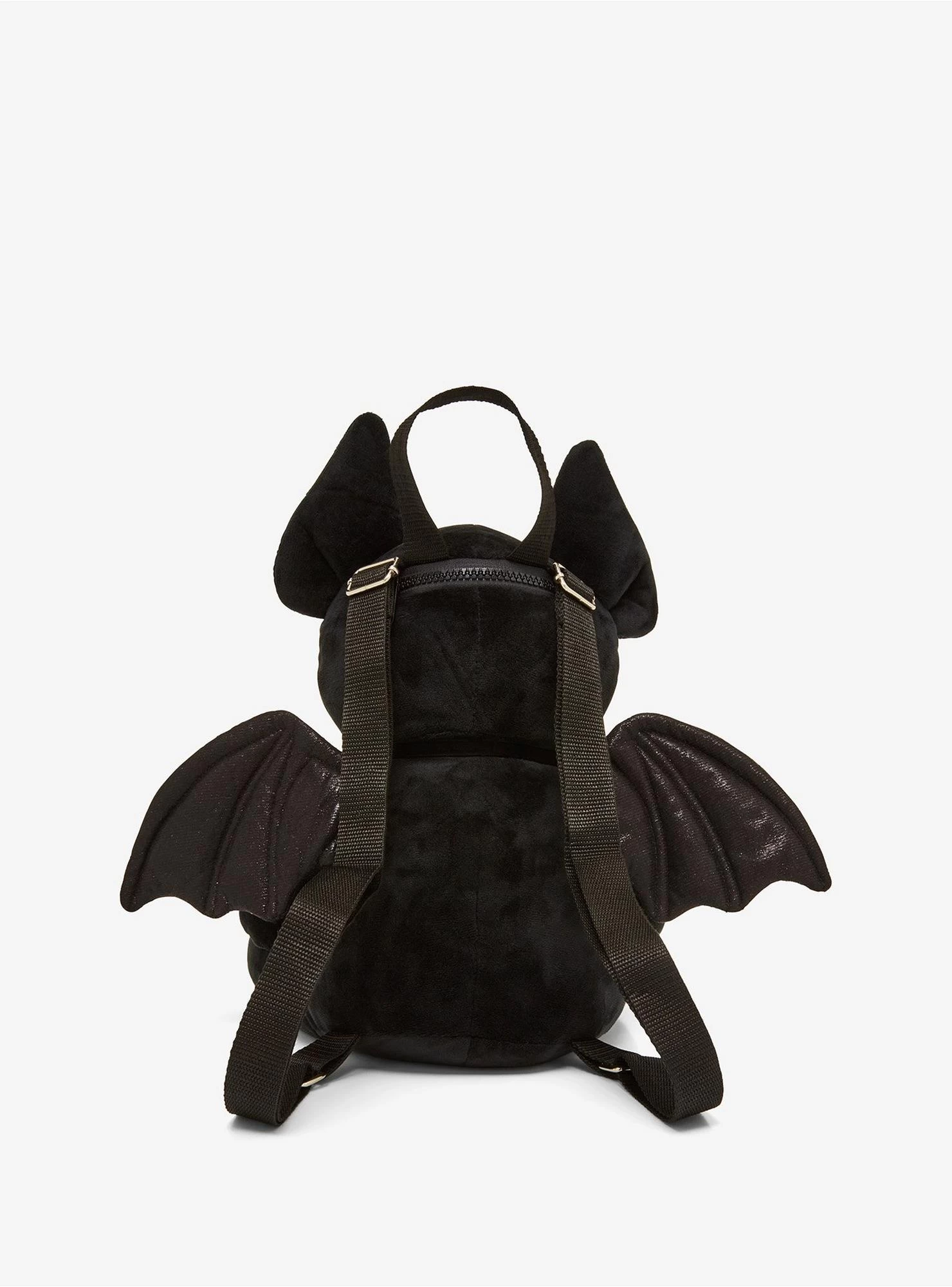 Meet your new creepy and cute sidekick! This plush backpack features a bat bear with red splatter detailing and zippered back pocket.