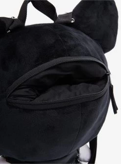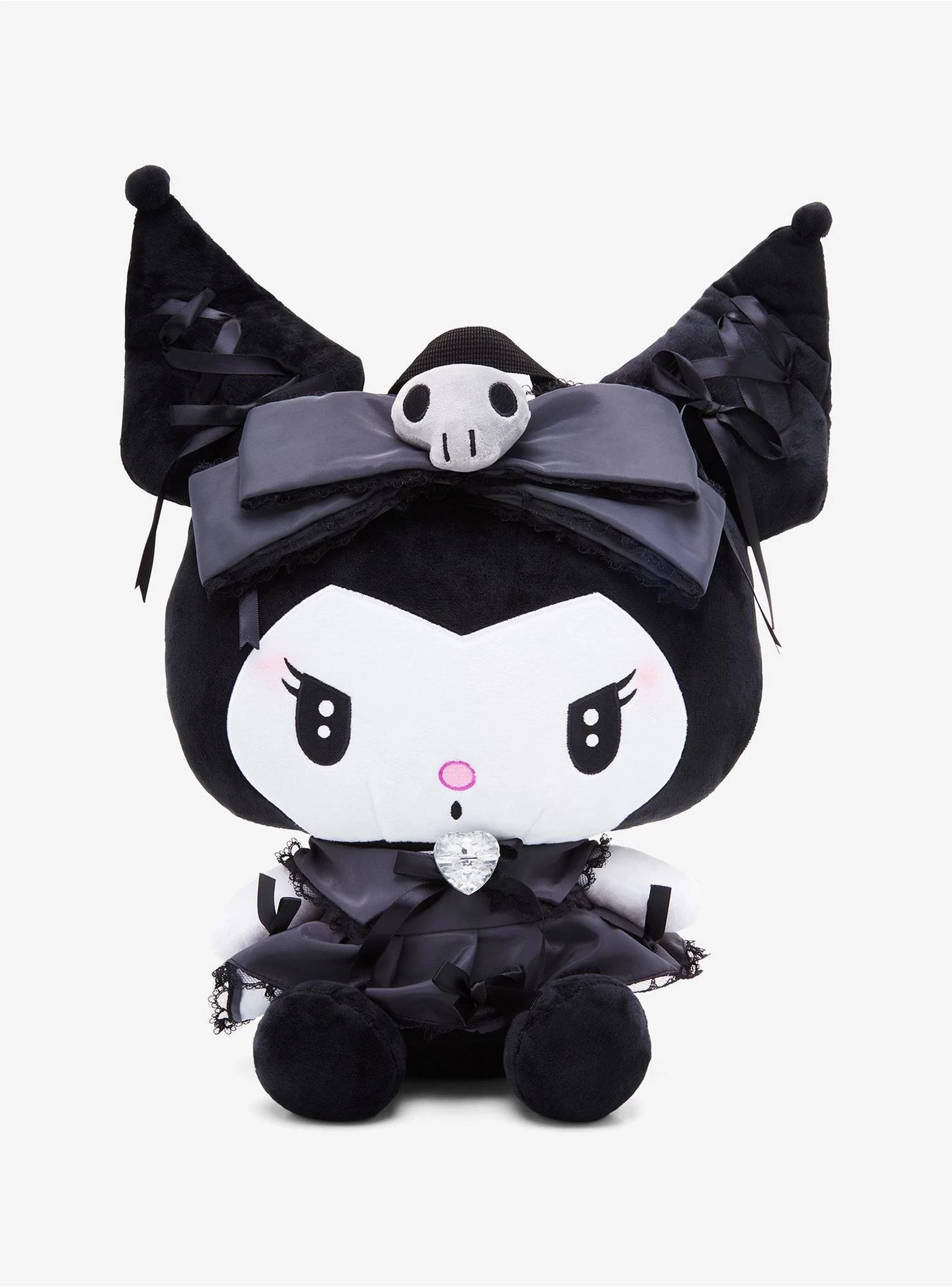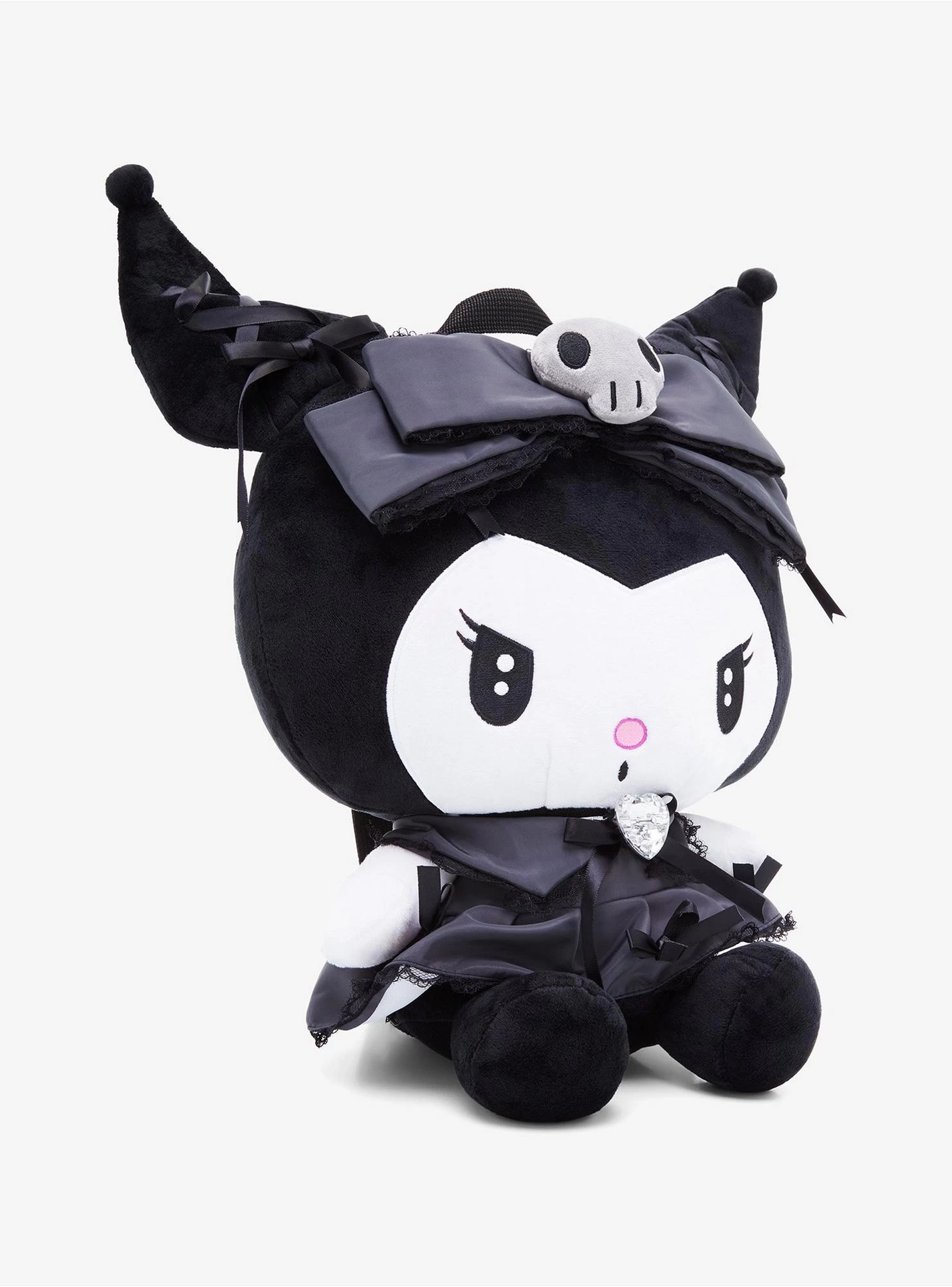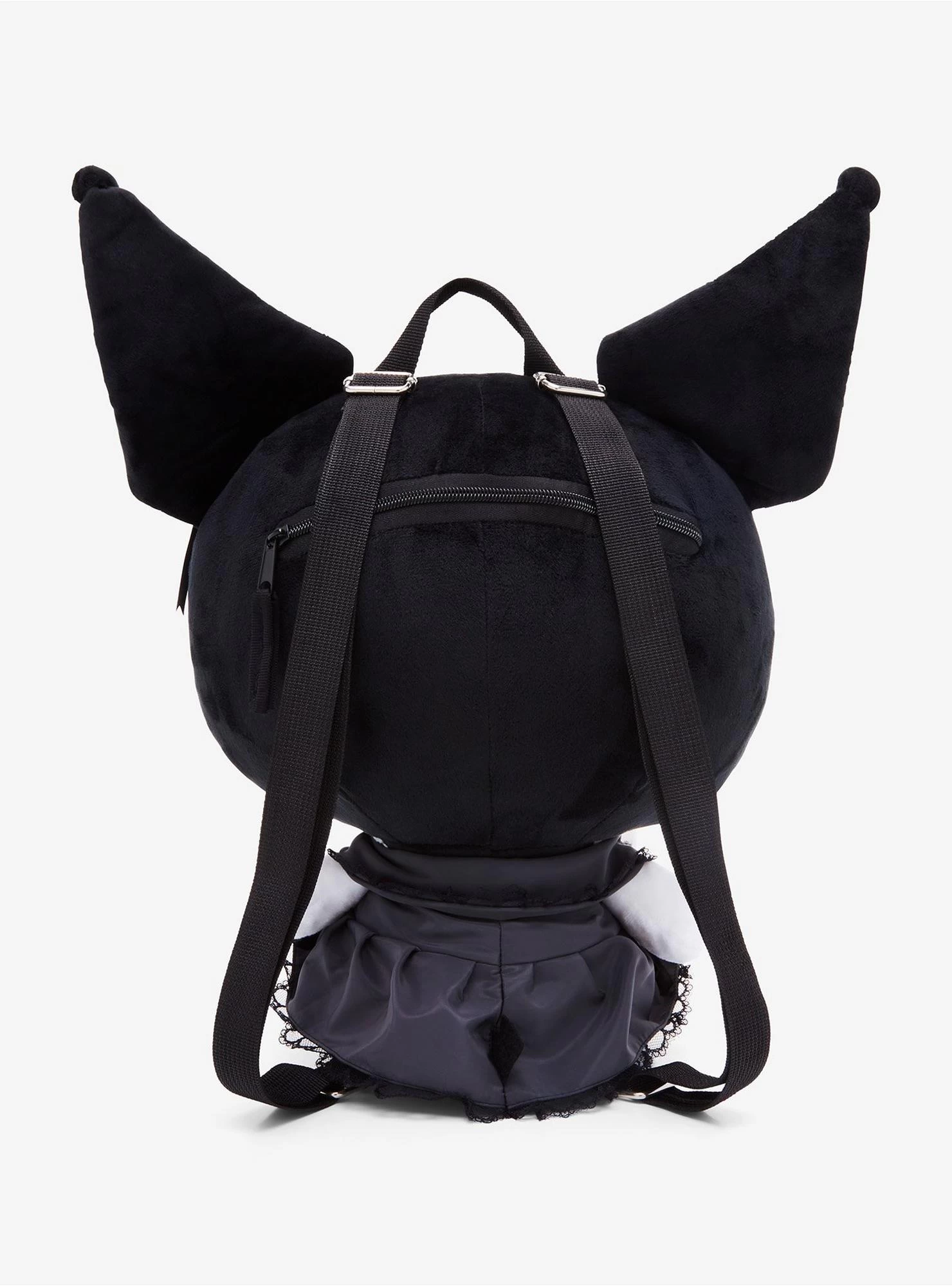 The cutest of all plush backpacks is ready to join your Sanrio collection! This Kuromi plush backpack is dressed to the nines, with your Sanrio fave dressed in a Lolita-inspired satin black dress with black bow accents all over and up her ears, plus a large rhinestone heart gem at the center of her chest. Complete with plush black bow on her head, adjustable straps and a back zipper.