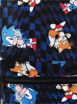 This backpack is guaranteed to withstand supersonic speeds, especially with Sonic and Tails here! Rep your favorite game with this Sonic the Hedgehog backpack, featuring a warped checkerboard pattern with Sonic and Tails all over. Comes with front zipper pocket, interior laptop sleeve and adjustable straps.