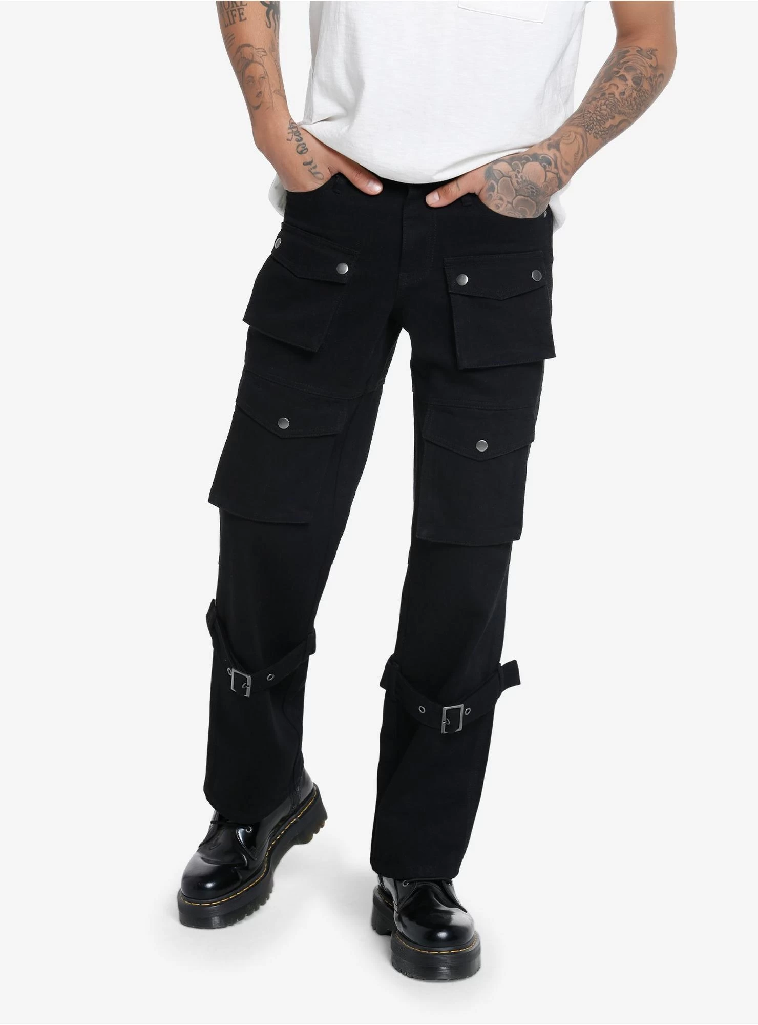 ‘Cause you can never have too many black pants. Level up your basics with this pair, featuring a straight leg fit. Comes with cargo pockets down the thigh and grommet buckle strap detailing around the calf.