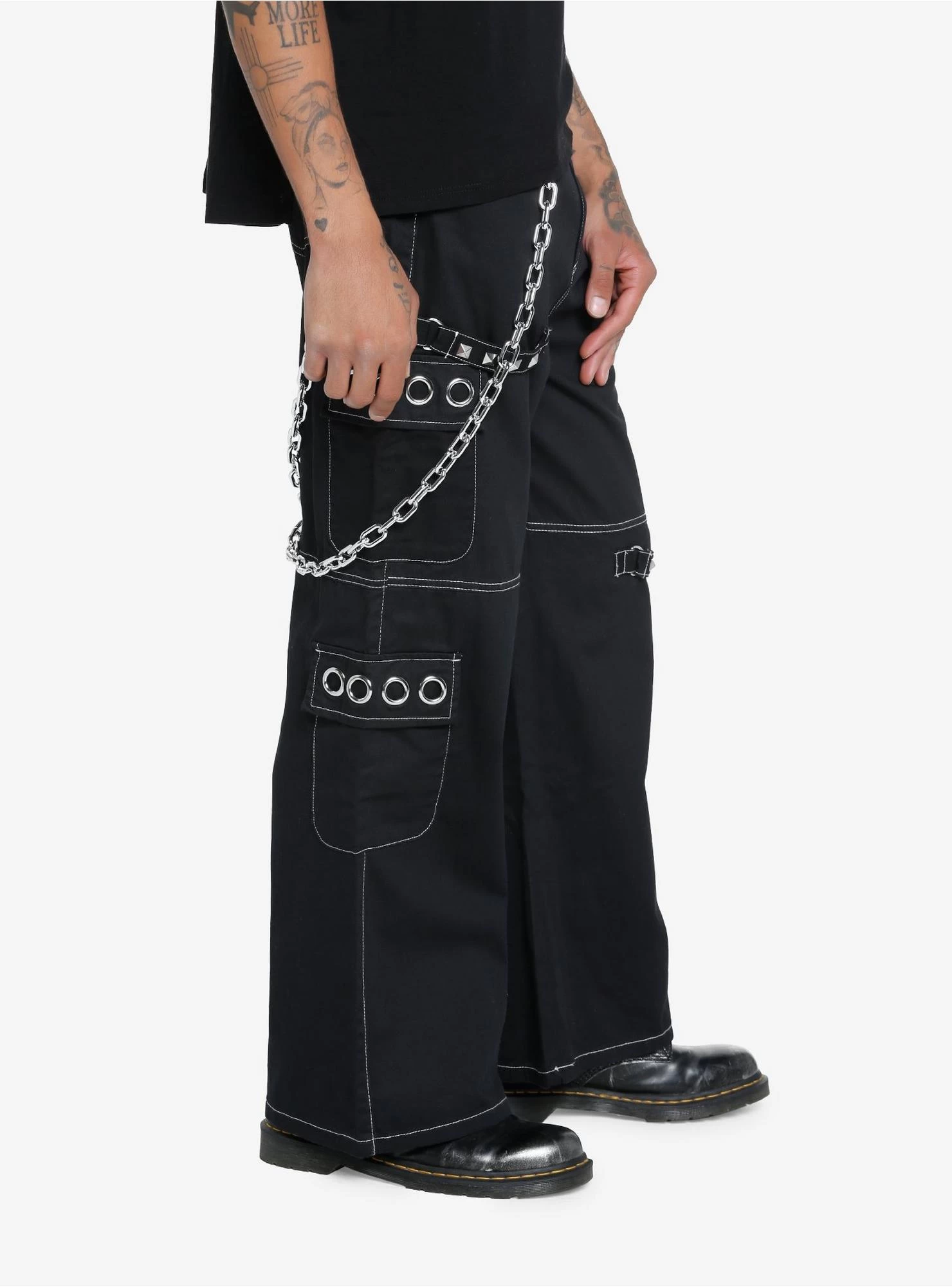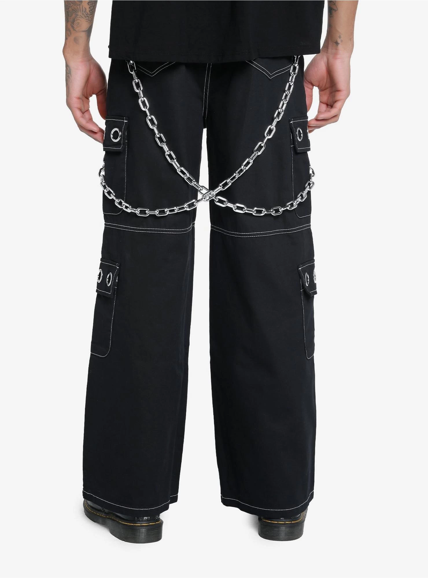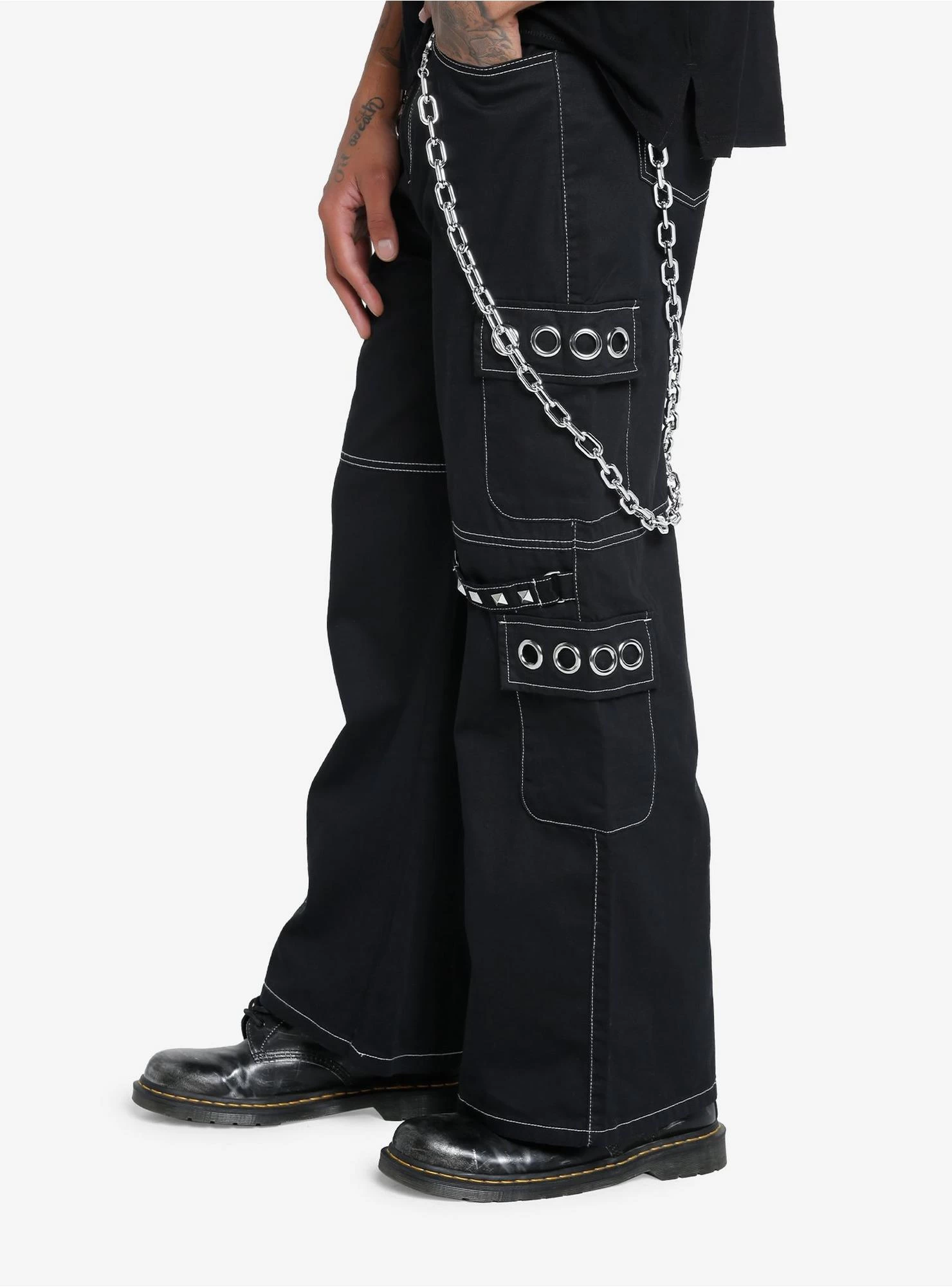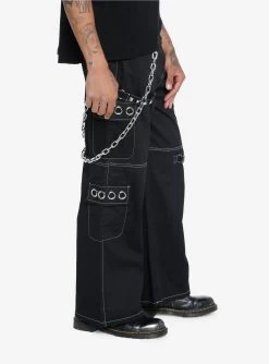 These are the tough version of cargo pants! This black pair has white contrast stitching, grommets on the pocket flaps, removable chains on both sides and studded straps.