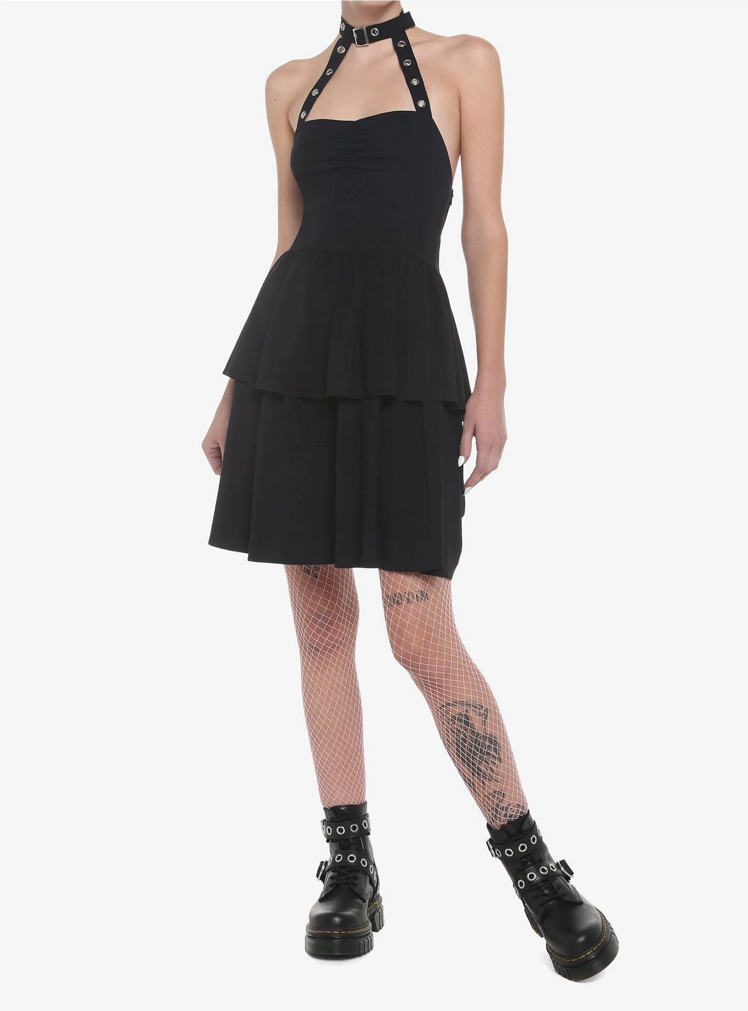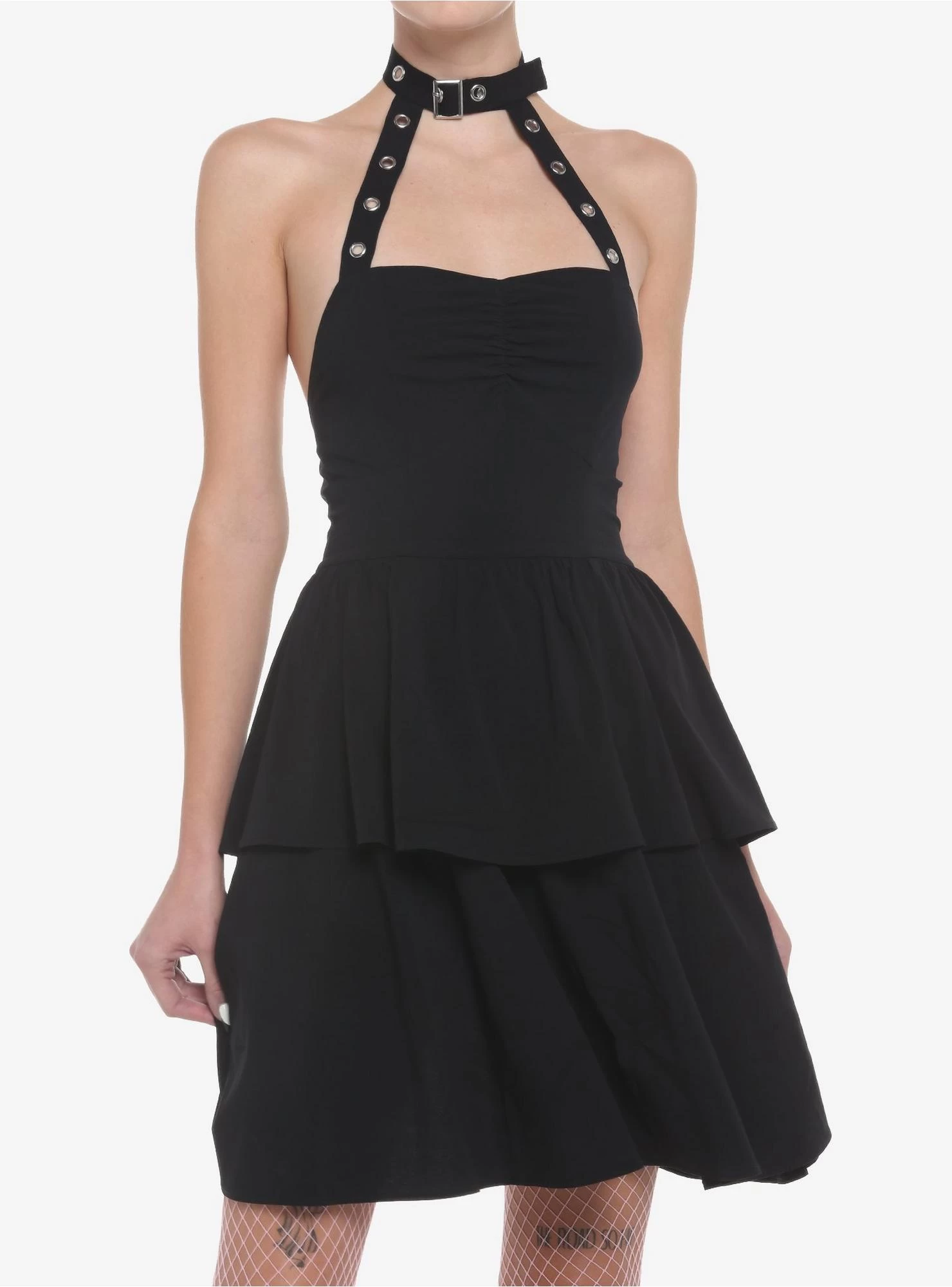 It’s all about the details. Elevate your little black dress look with some hardware! This dress features a tiered skirt and a sweetheart neckline. Comes with choker halter straps with grommet and buckle detailing, a half elasticated back and back zipper closure.