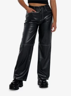 You will wear these with everything. These black faux leather pants have white contrast stitching and a straight leg.
