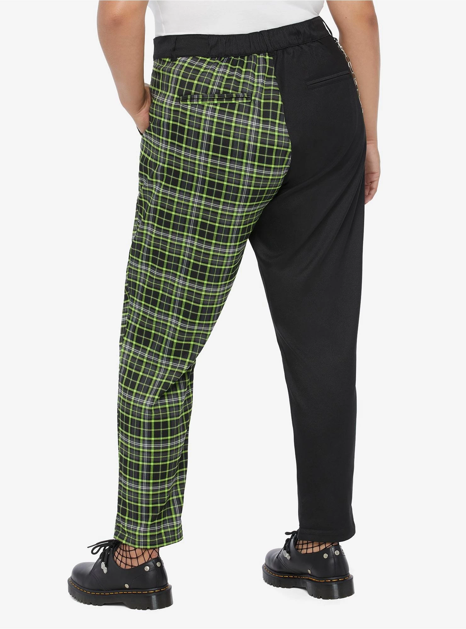 No need to decide between prints or solids with this pair of pants! They feature a solid black and green plaid split design and cuffed ankles. Comes with hip and back pockets, plus a removable, silver-tone side chain.