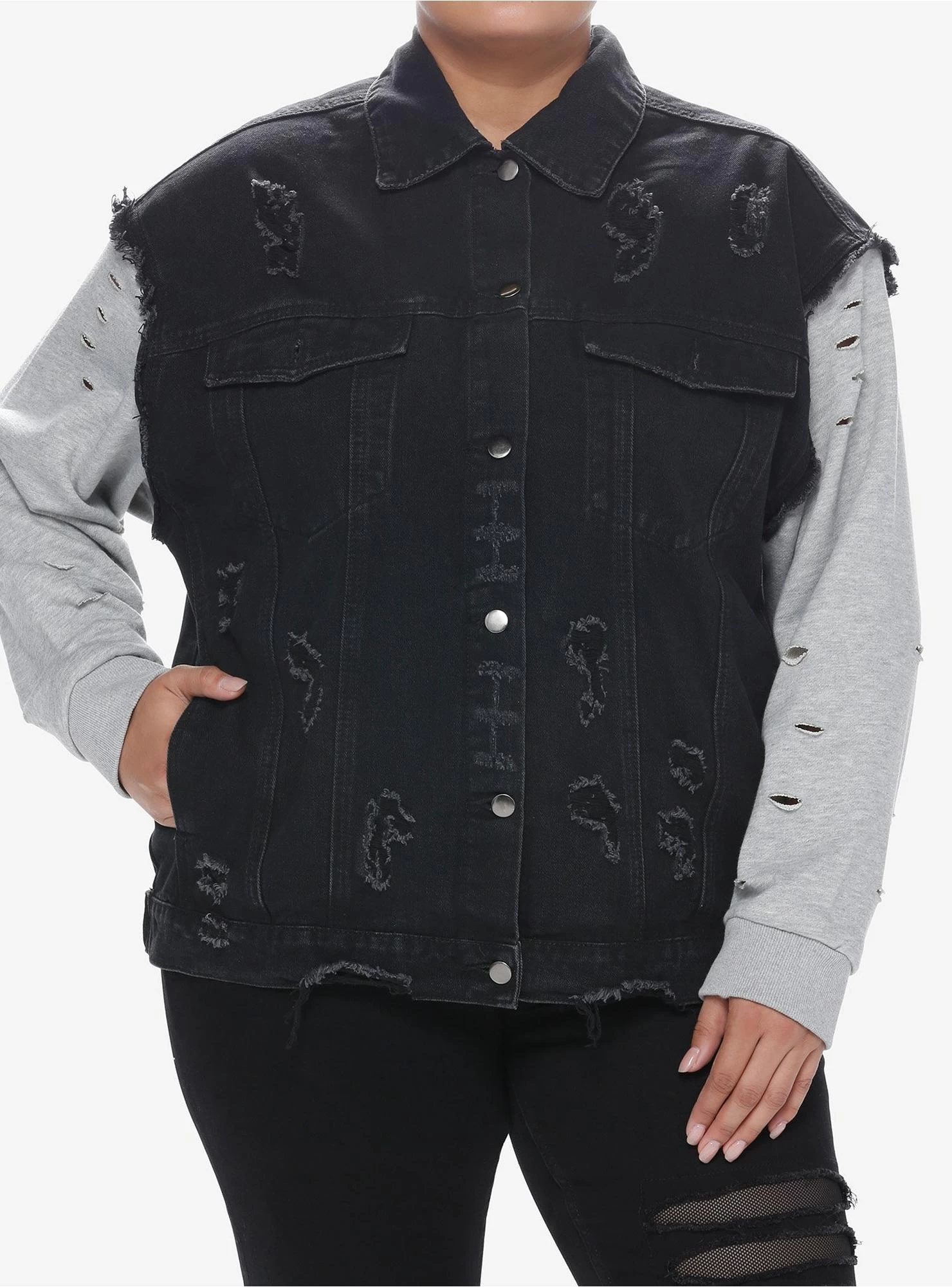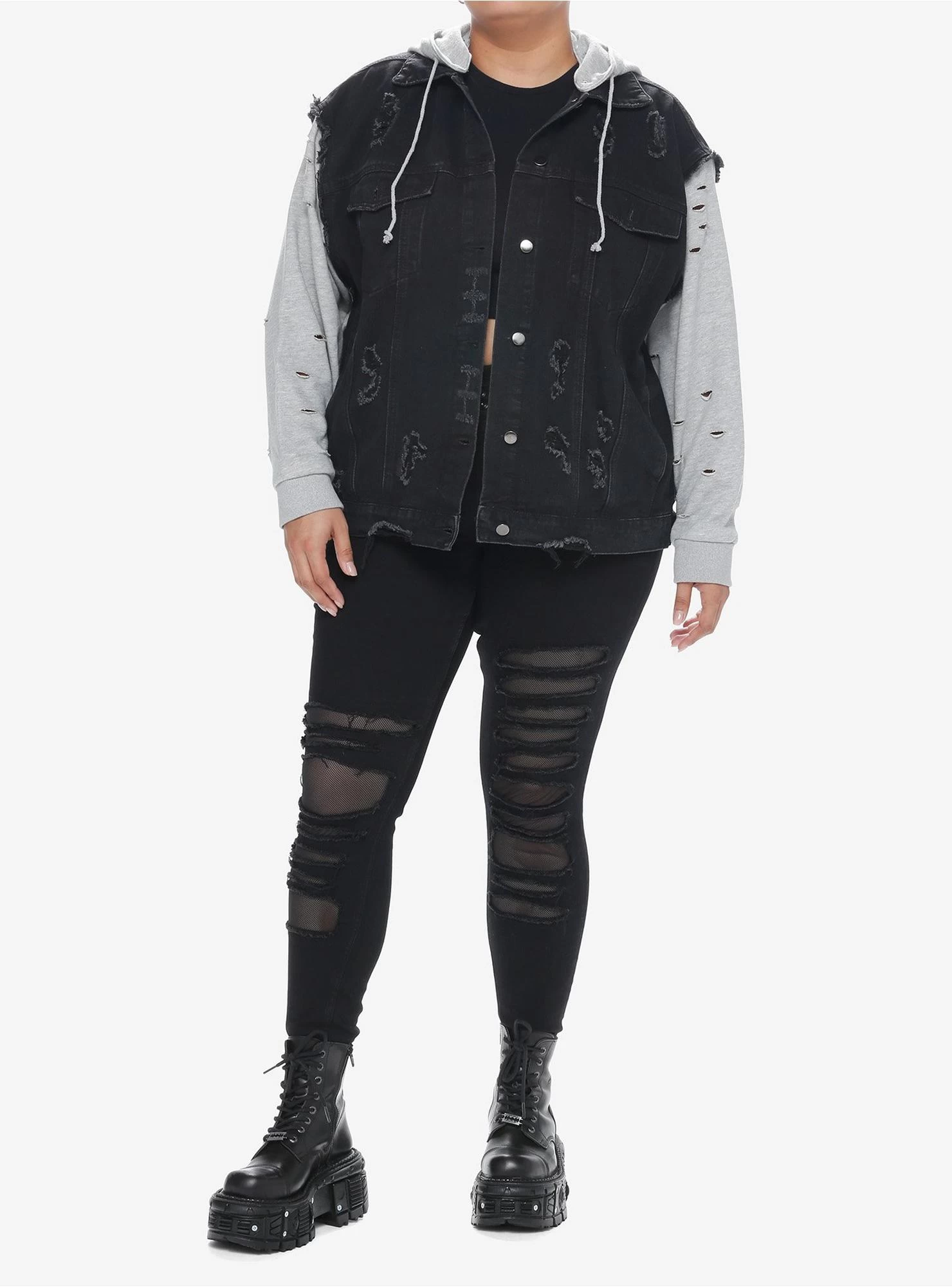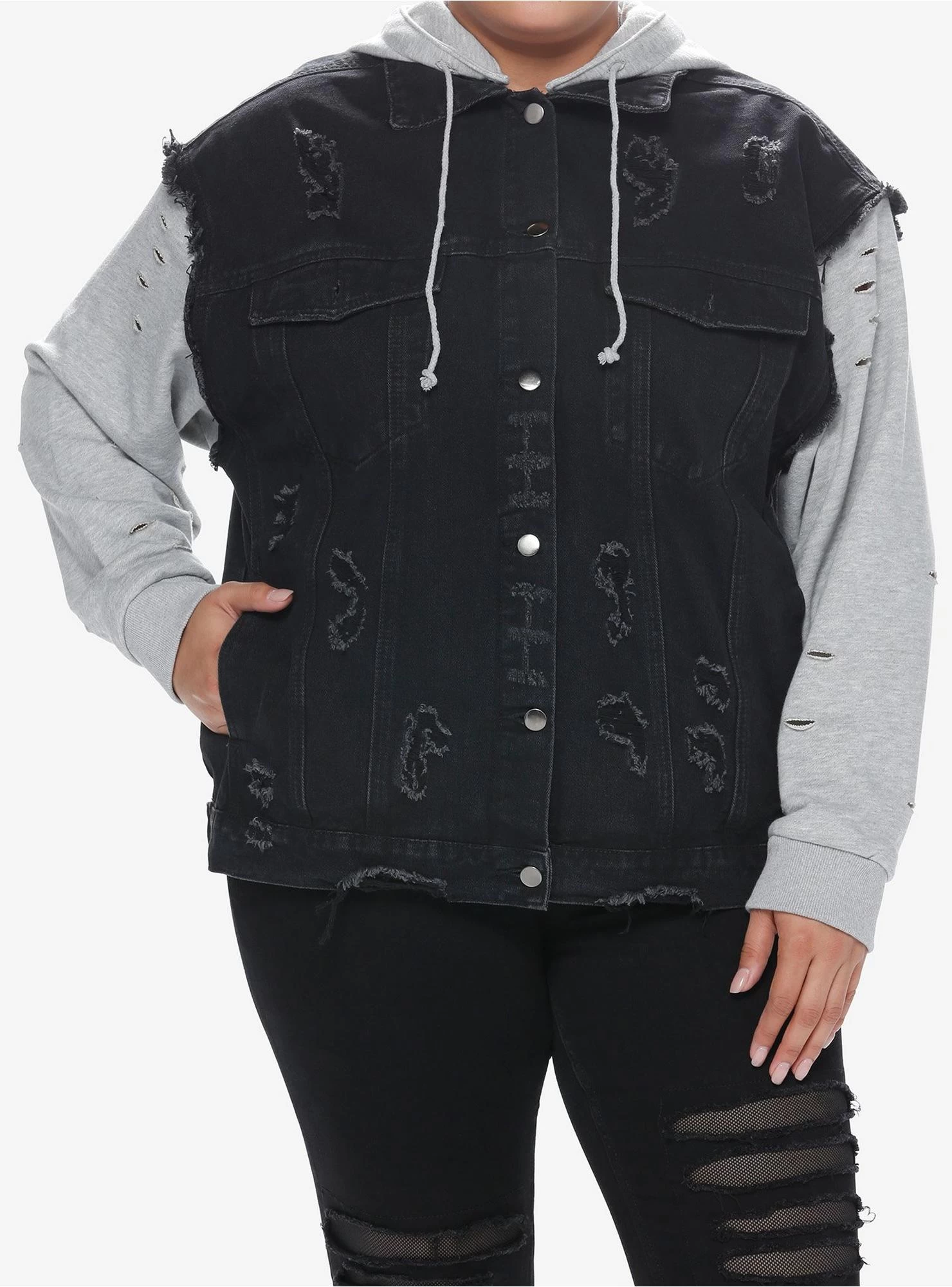 If you need a jacket for the fall season, look no further than this twofer style! It combines a grey hoodie with a distressed black denim vest (complete with side and chest pockets. The hood is detachable and has a drawstring.