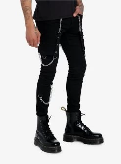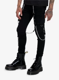 Elevate your look with some hardware! This black pair of stinger jeans feature cargo pockets with D-ring detailing, plus double chain straps with grommet tape accents.
