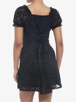 Keep your gothic vibes fun and flirty with this black babydoll dress! Featuring an allover floral lace design, puff sleeves and ruching at the bust. Complete with lace-up detailing on the back and side seam pockets.