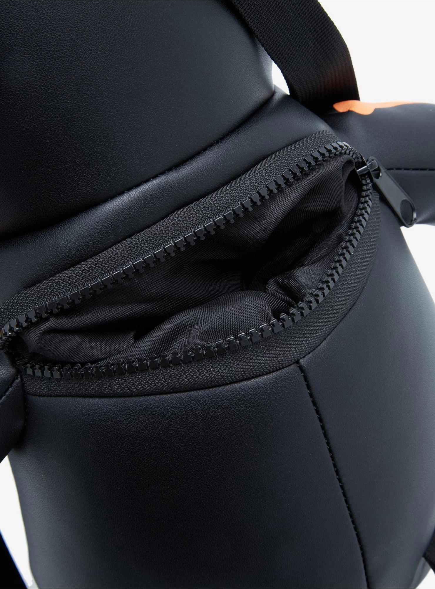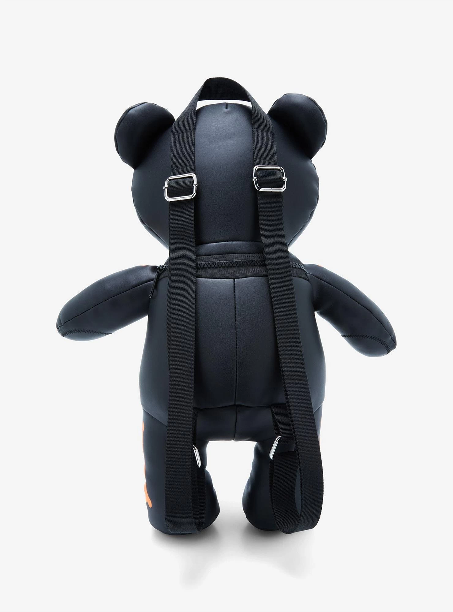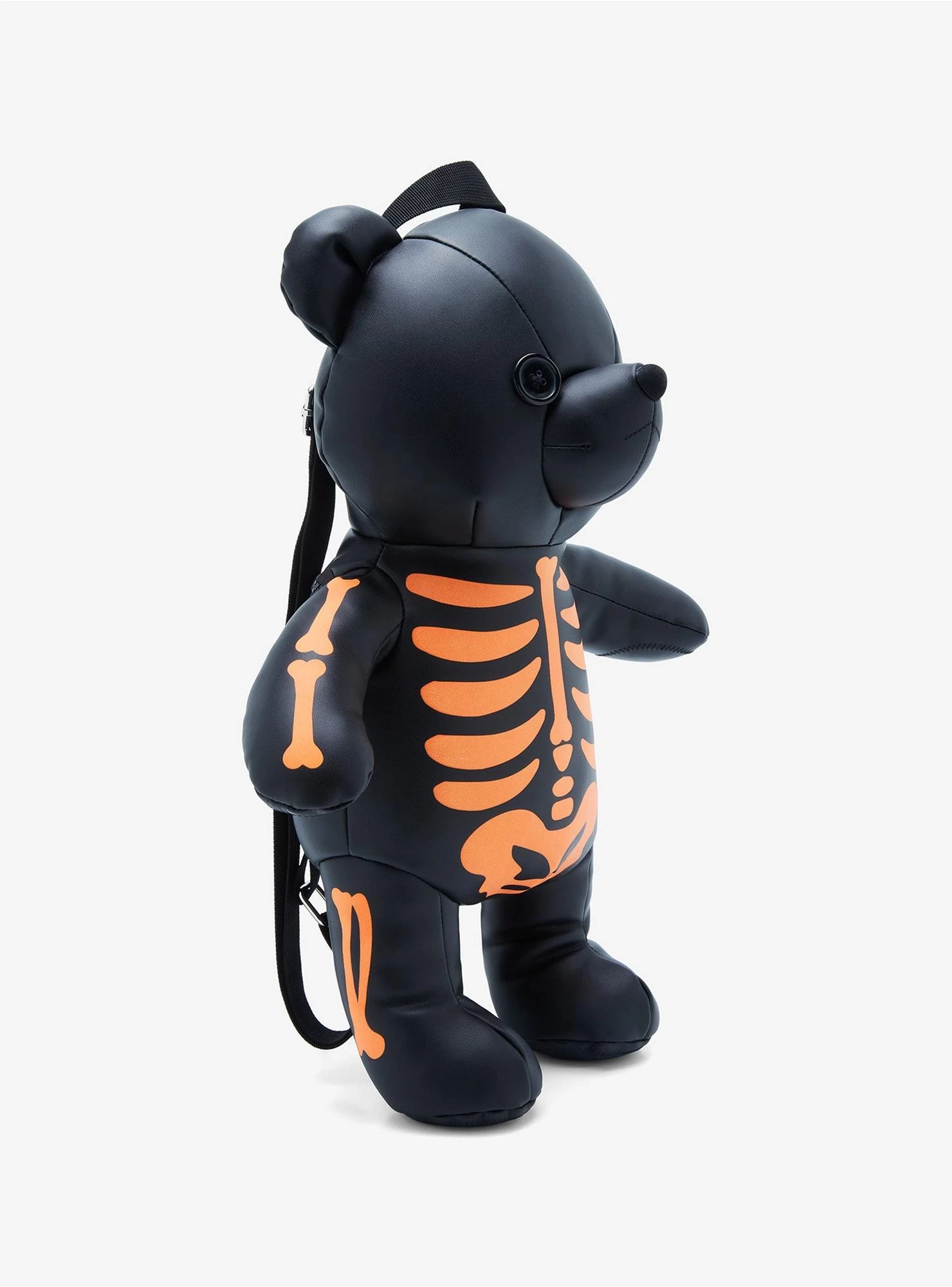 Channel Halloween vibes all year with this faux leather skeleton bear mini backpack! It is printed with orange ribs, pelvis bones, arm bones and leg bones. It has a zippered compartment on the back. Adjustable straps.