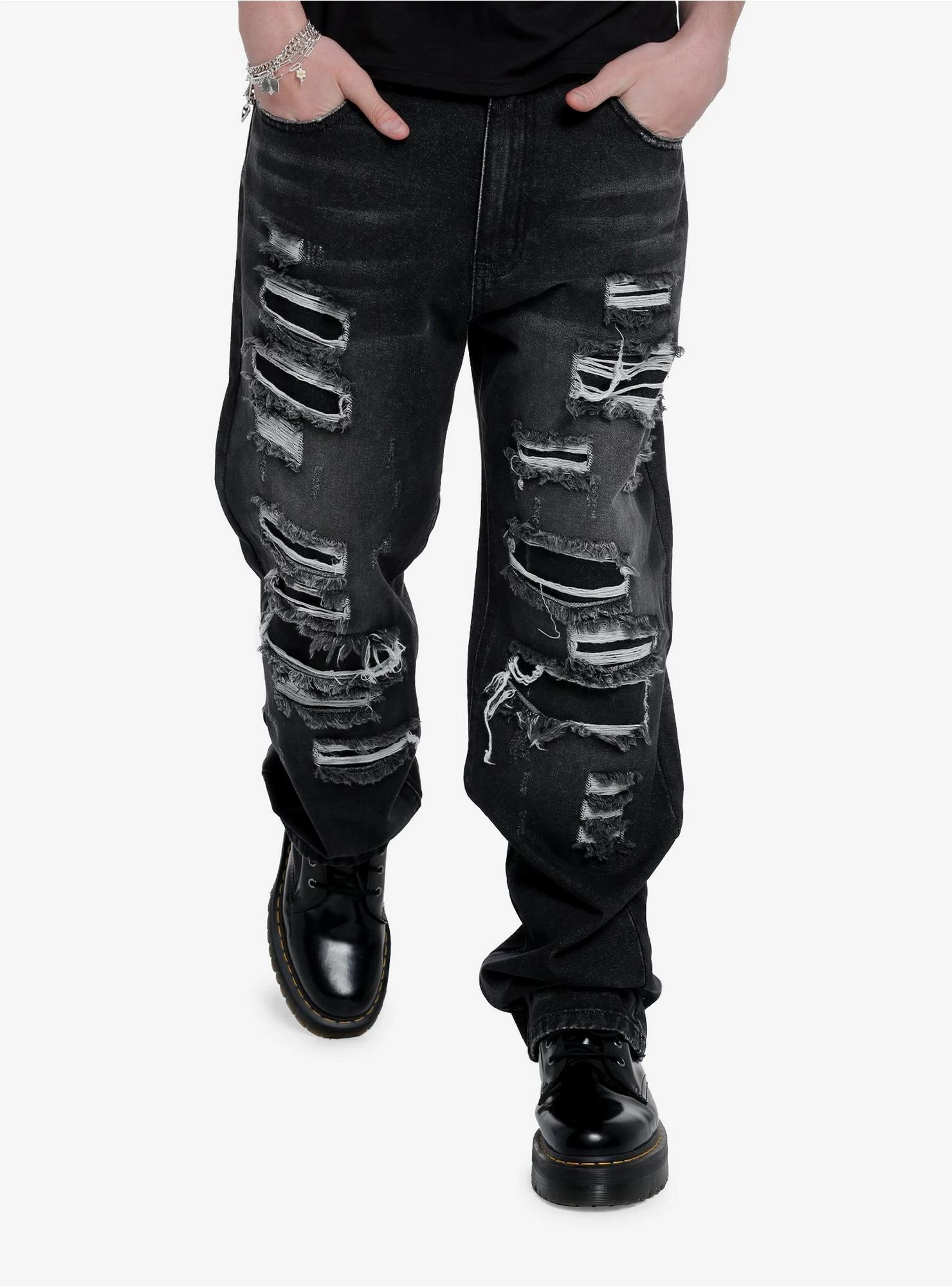 Effortlessly get the ripped jean look with this stylish pair! These black jeans feature a light grey wash and destruction down both legs. Comes with classic 5-pocket styling.