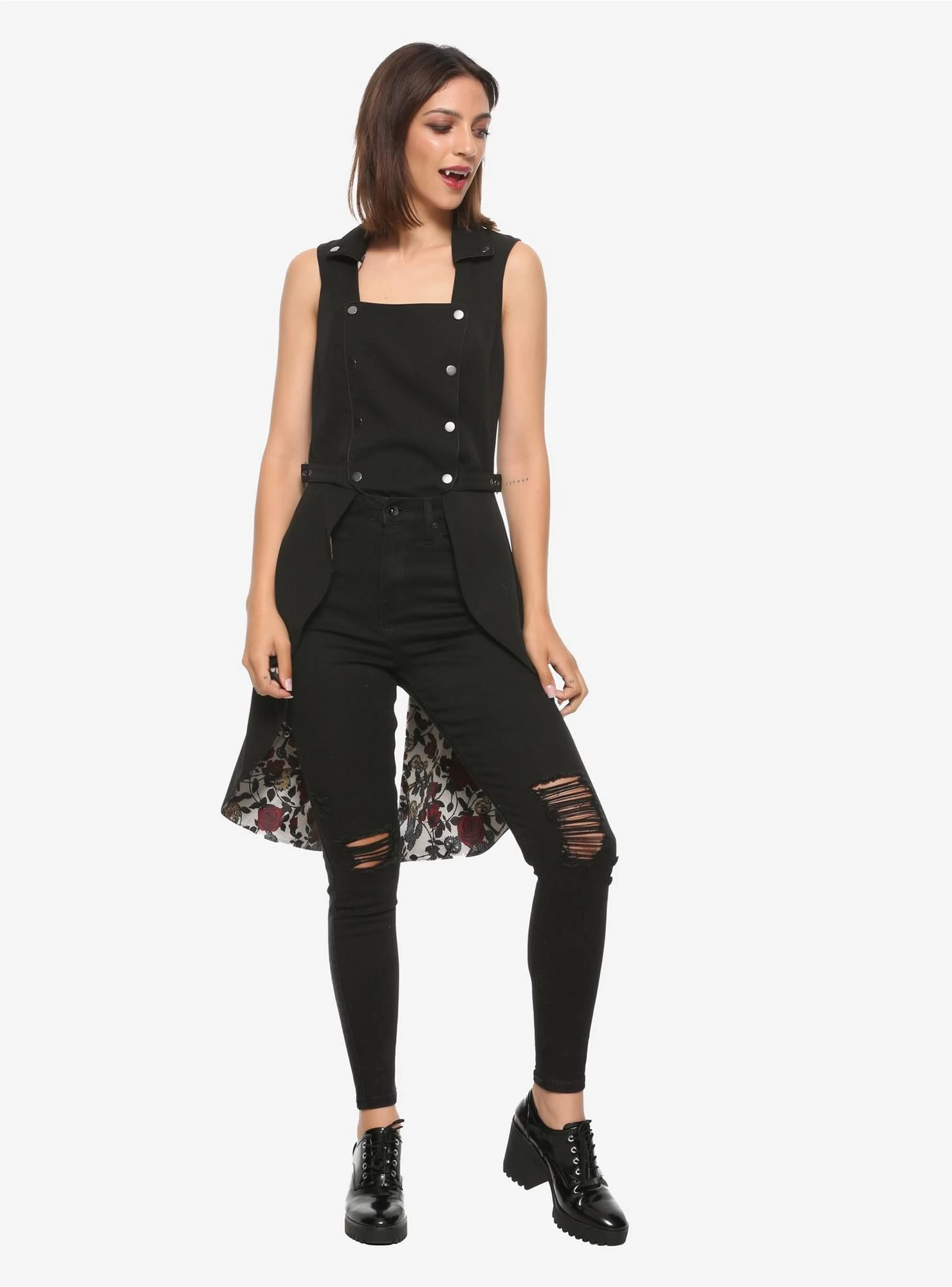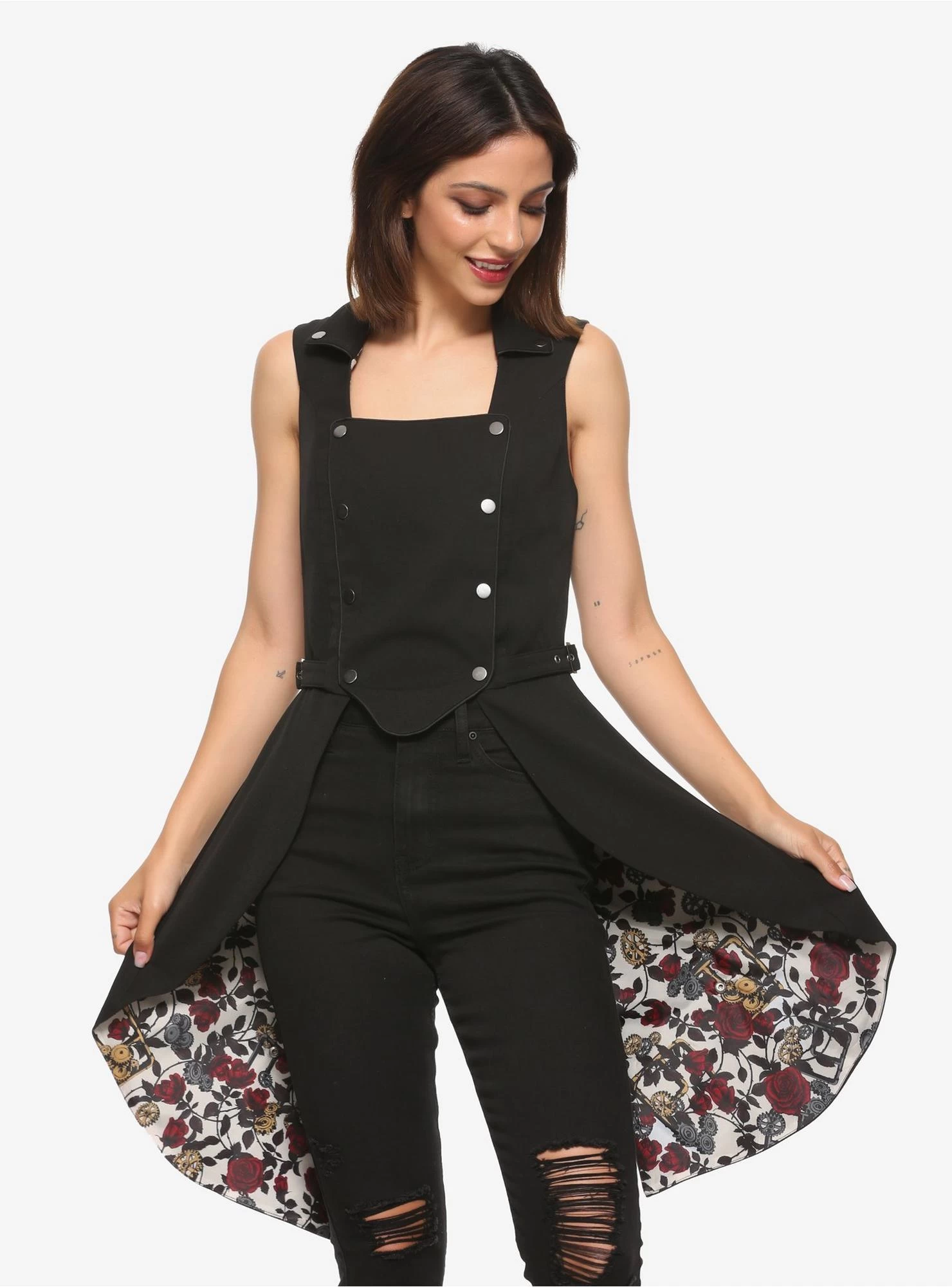 This vest screams “I have arrived and I’m ready to ride.” The black textured vest has a double-breasted burnished silver snap-front closure and is accented with buckles at the waist and snap details at the lapel and coat tails. The long tails reveal a very steampunk lining, with gears, vines and red roses. Wear it as a layering piece over a tee or tank, or on its own as a top. Either way, you know boots are essential to complete the look.