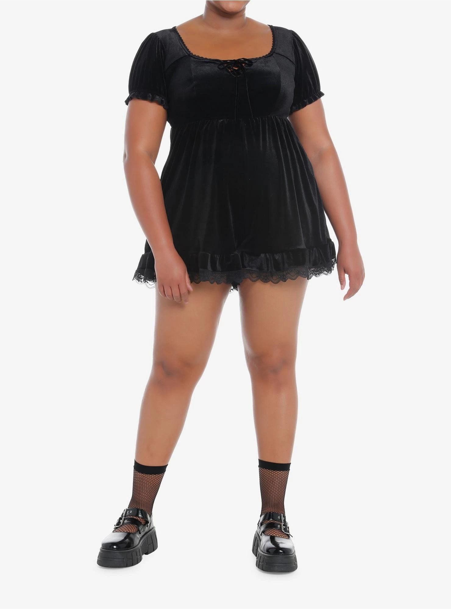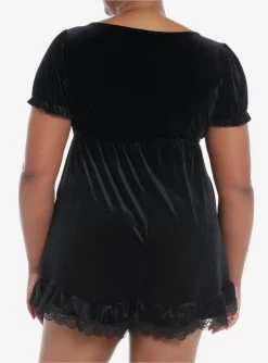 Romp around in a cute new outfit! This black velvet romper has ruffle sleeves and a dainty lace neckline, plus lace-up details at the chest and large lace ruffles at the leg openings. Comes with hip pockets!