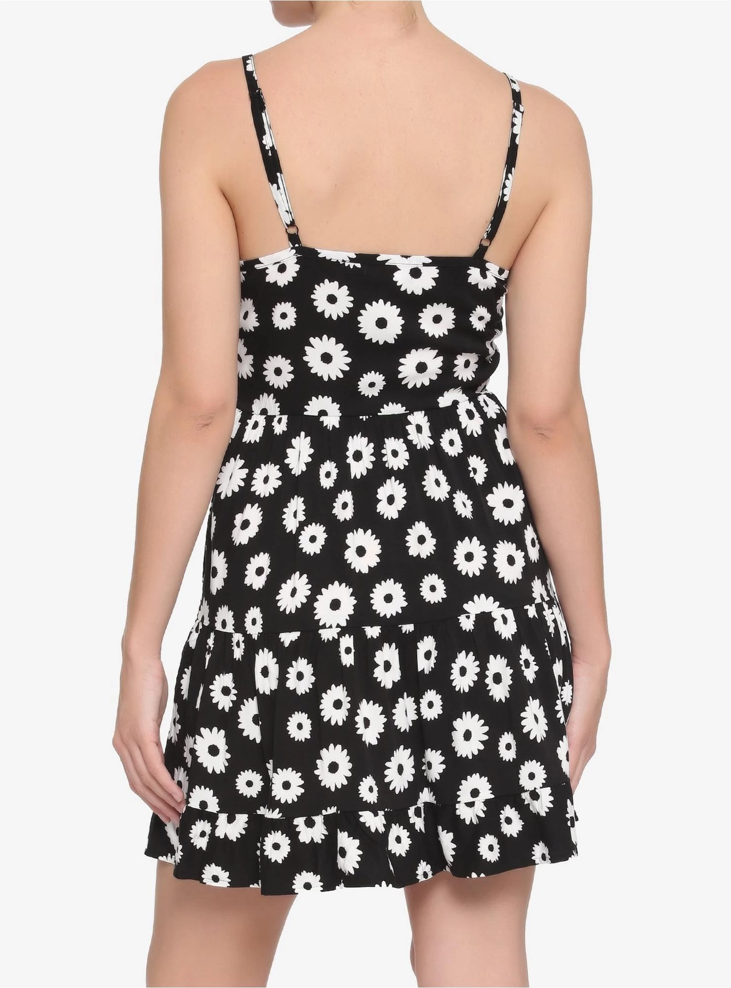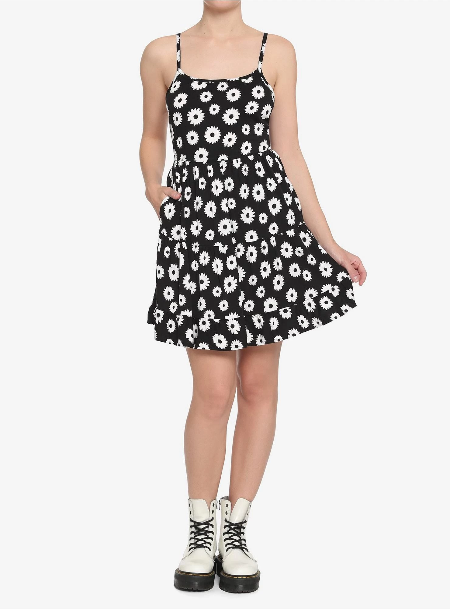 Love flowers, but hate color? Then we’ve got the perfect dress for you! This tiered dress features an allover black and white daisy print. Comes with adjustable spaghetti straps, an elasticated waistband and side seam pockets.