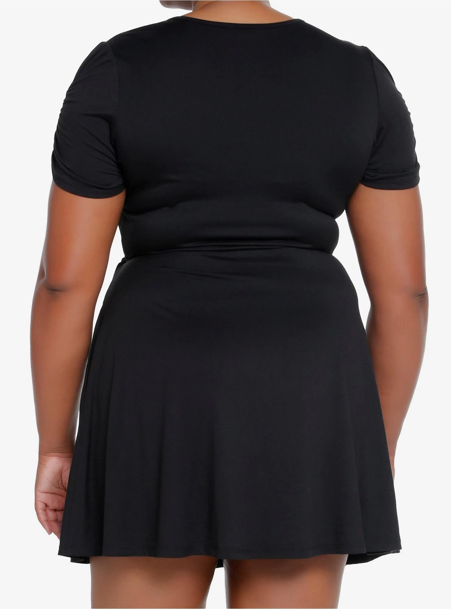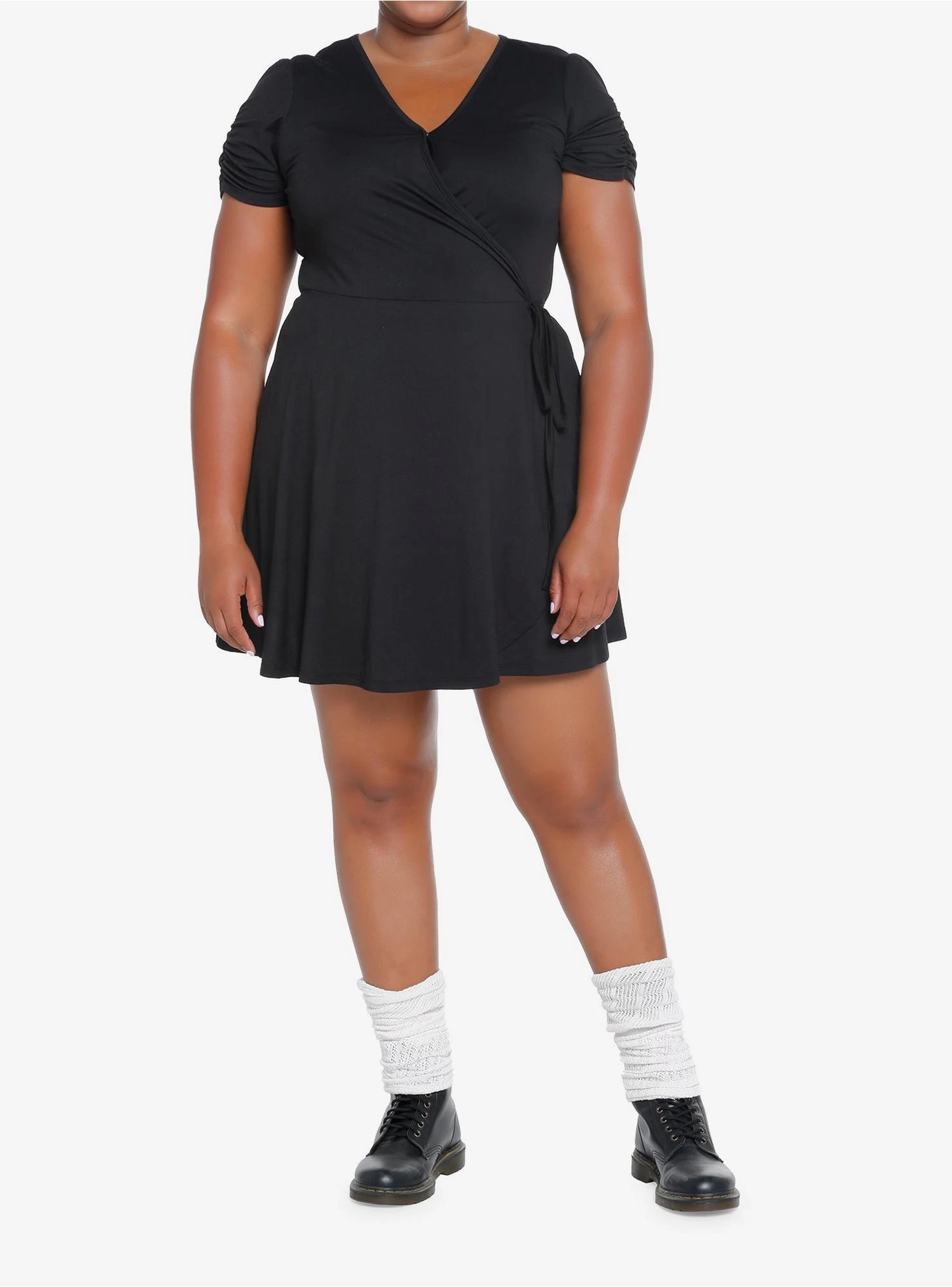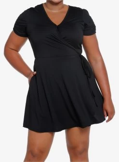 Looking for a new LBD? Wrap up the search, ’cause this is the one! This black dress has ruched short sleeves and a diagonal tie strap at the waist. Comes with pockets at the flared skirt.