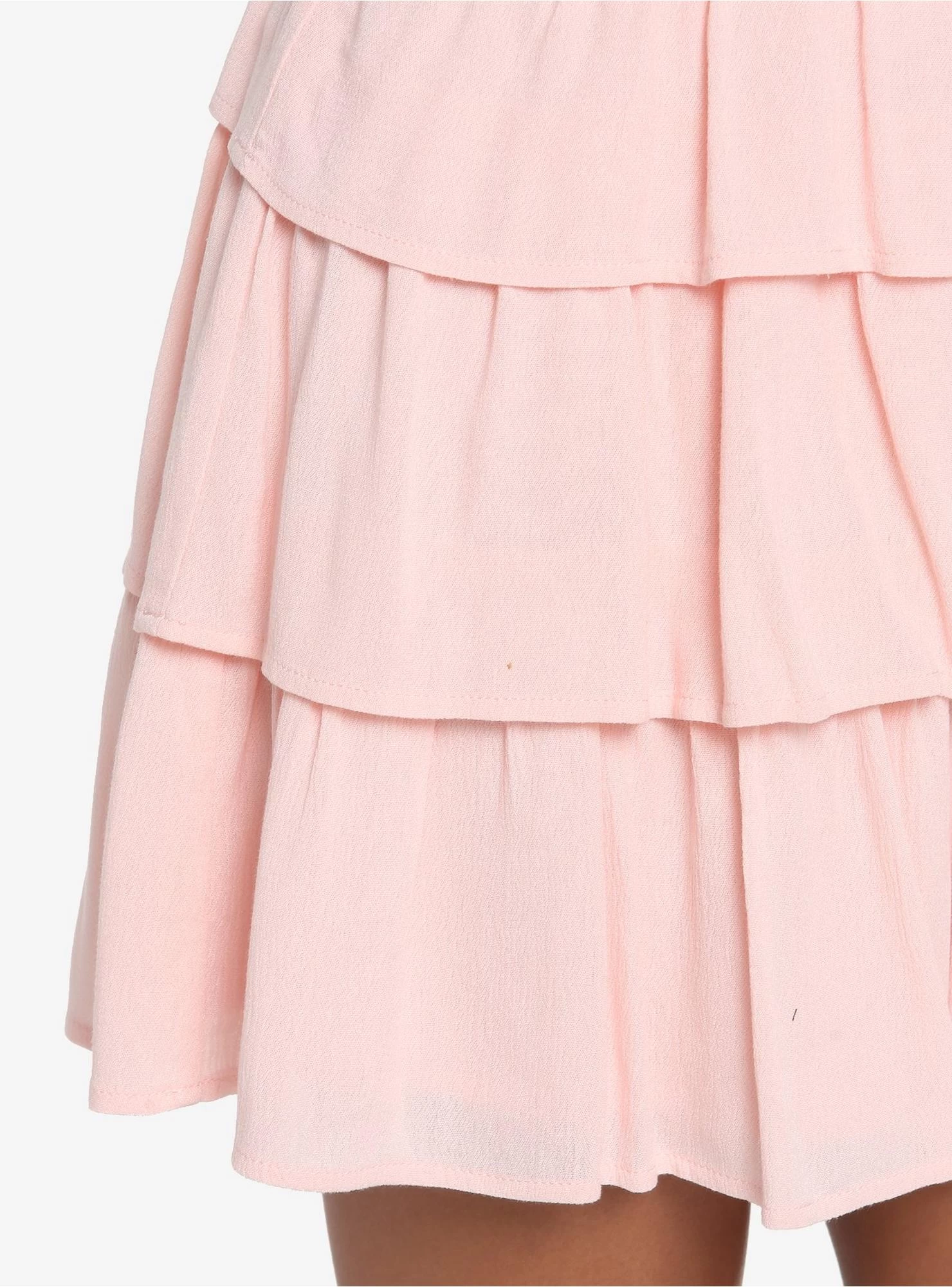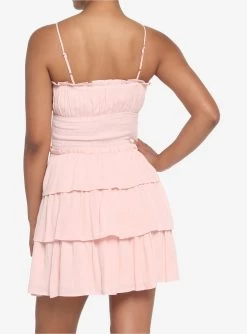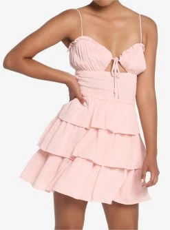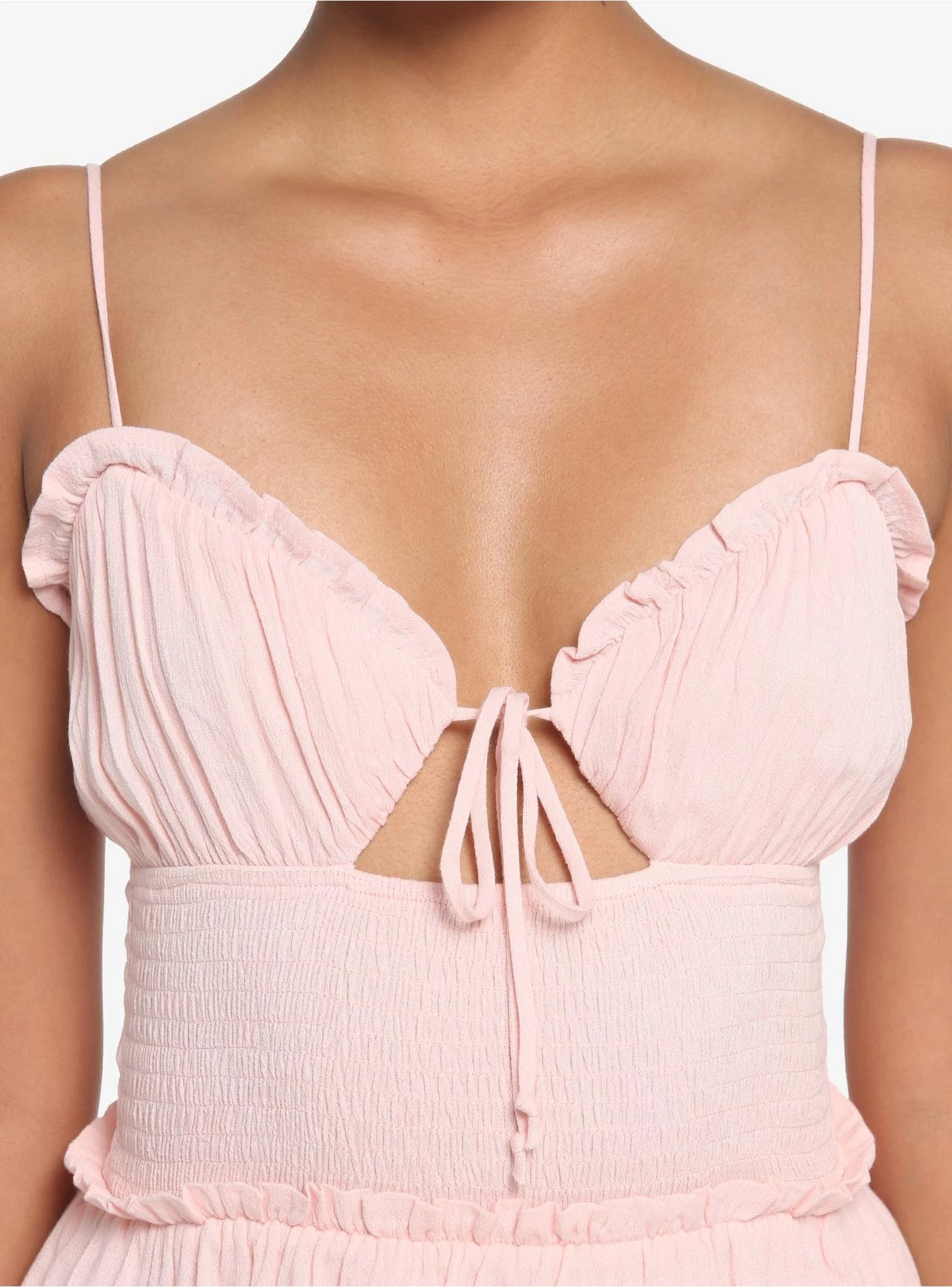 Get ready to twirl in this blush dress featuring a keyhole detail, tie on the front and tiered skirt.