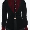 Keep your look dark and romantic with this black coat featuring a filigree brocade pattern, straps with metal grommets, two pockets and button-up closure.