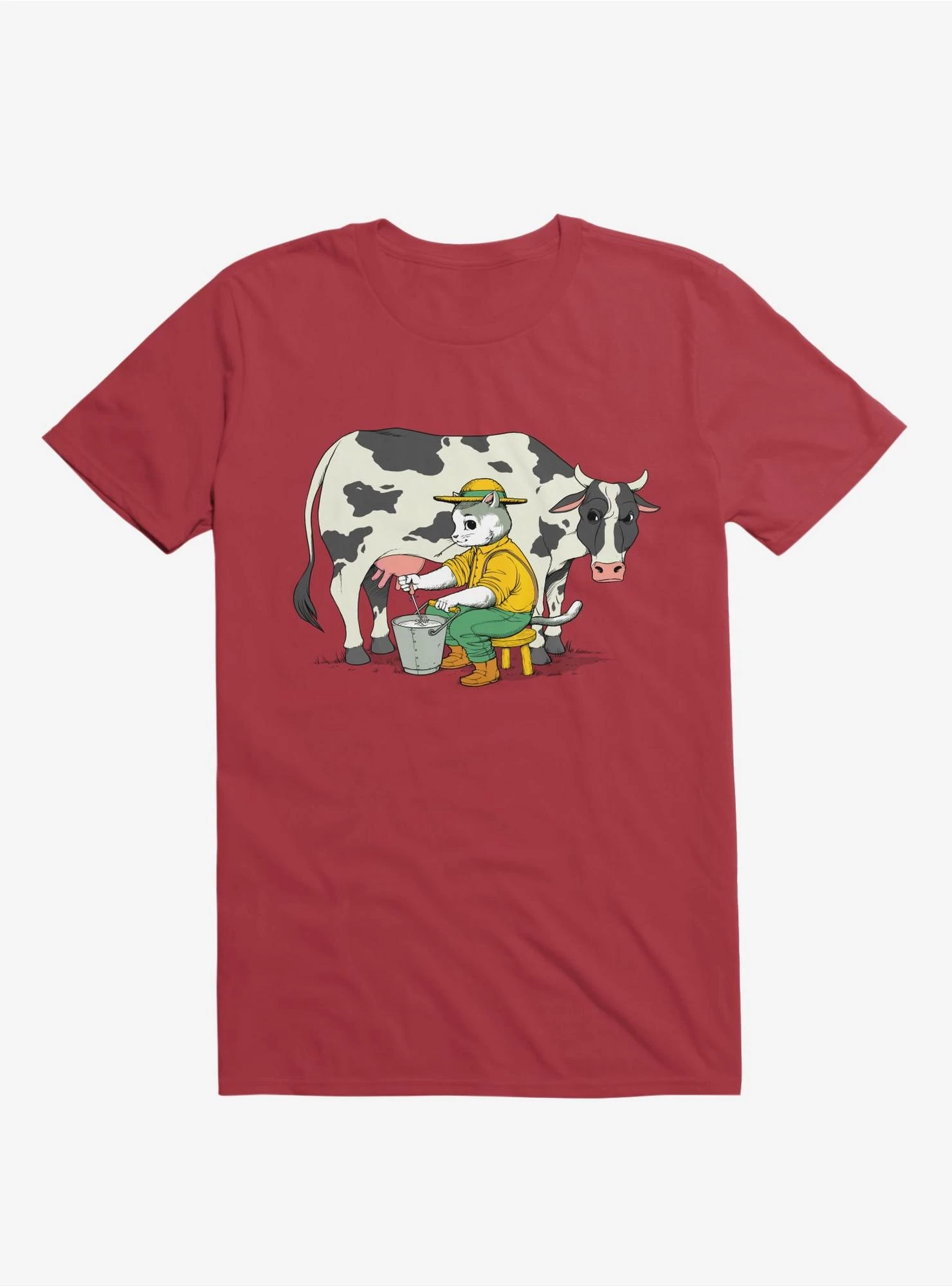 “Milk, ma’am” said the cat to the cow. And the cow kindly obliged. We think you’ll agree: Our lightweight red graphic tee that features a feline farmer milking a heifer is an udder delight.