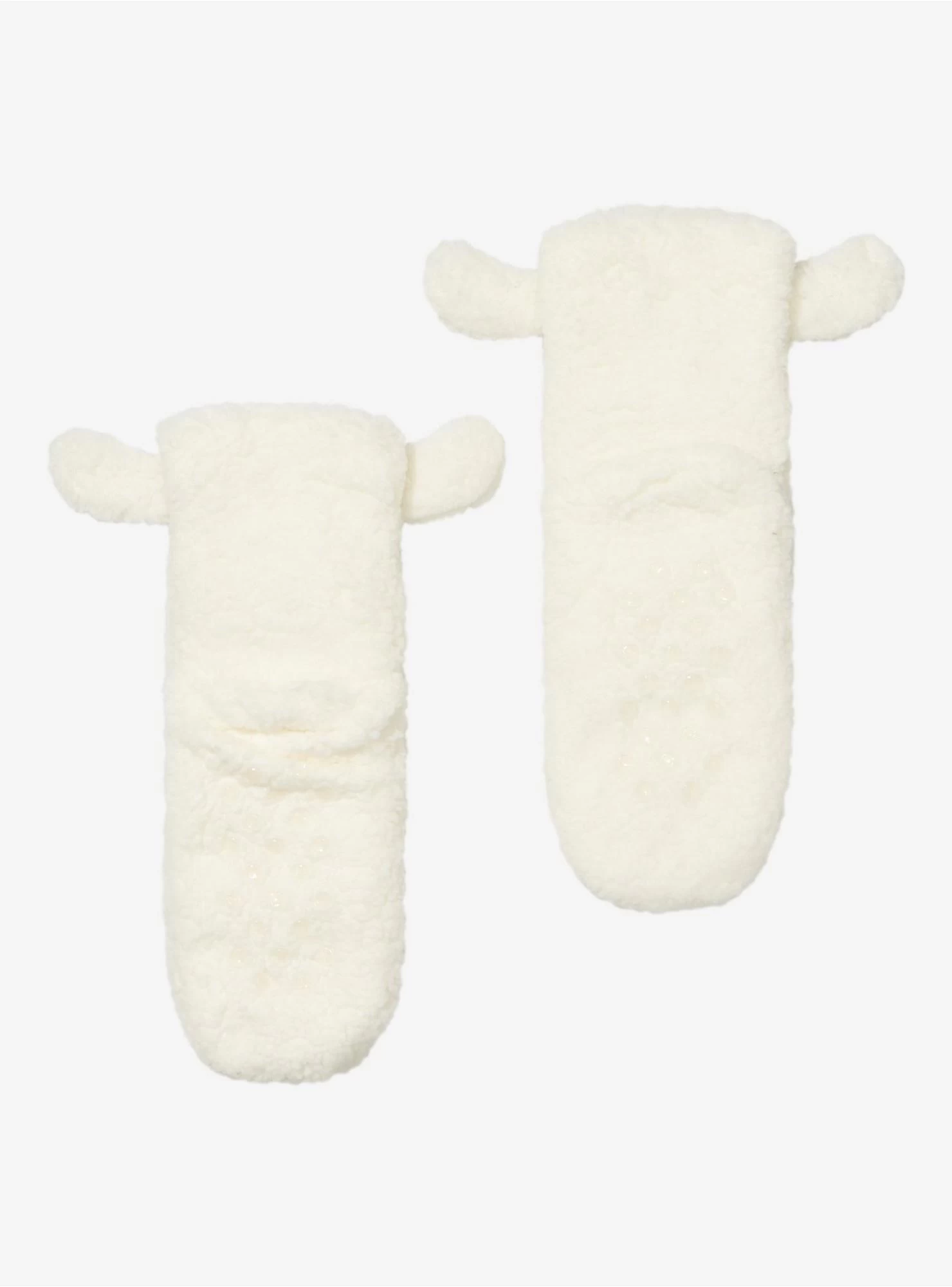 Cuddle up for a cozy night in with your Sanrio bestie. These fuzzy socks feature Cinnamoroll’s face embroidered at the top with 3D ear detailing. Comes with non-slip grips on the bottom.