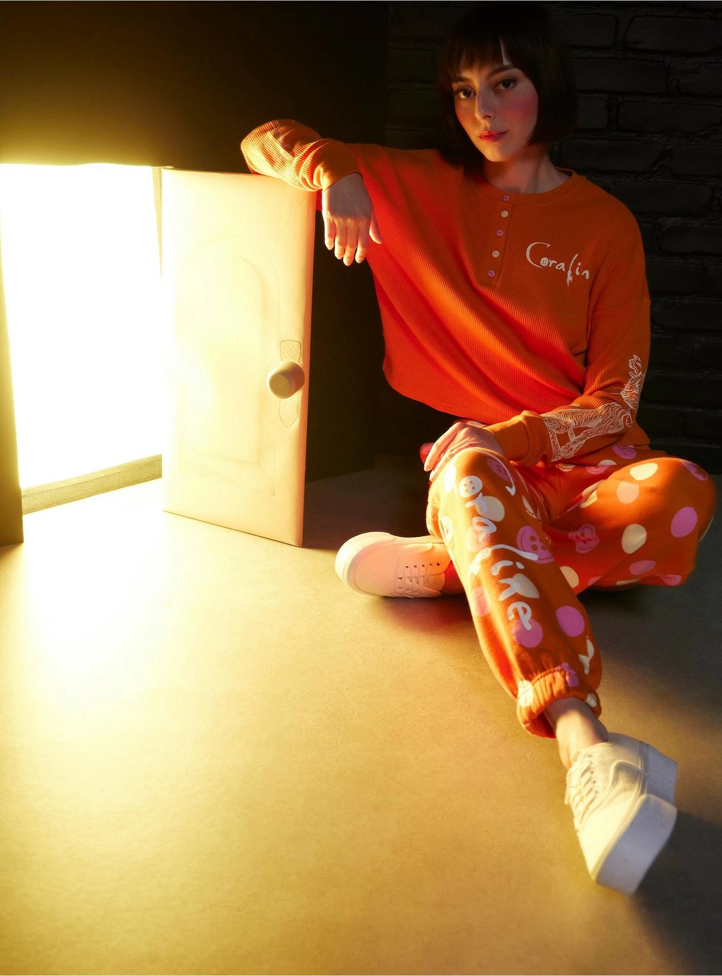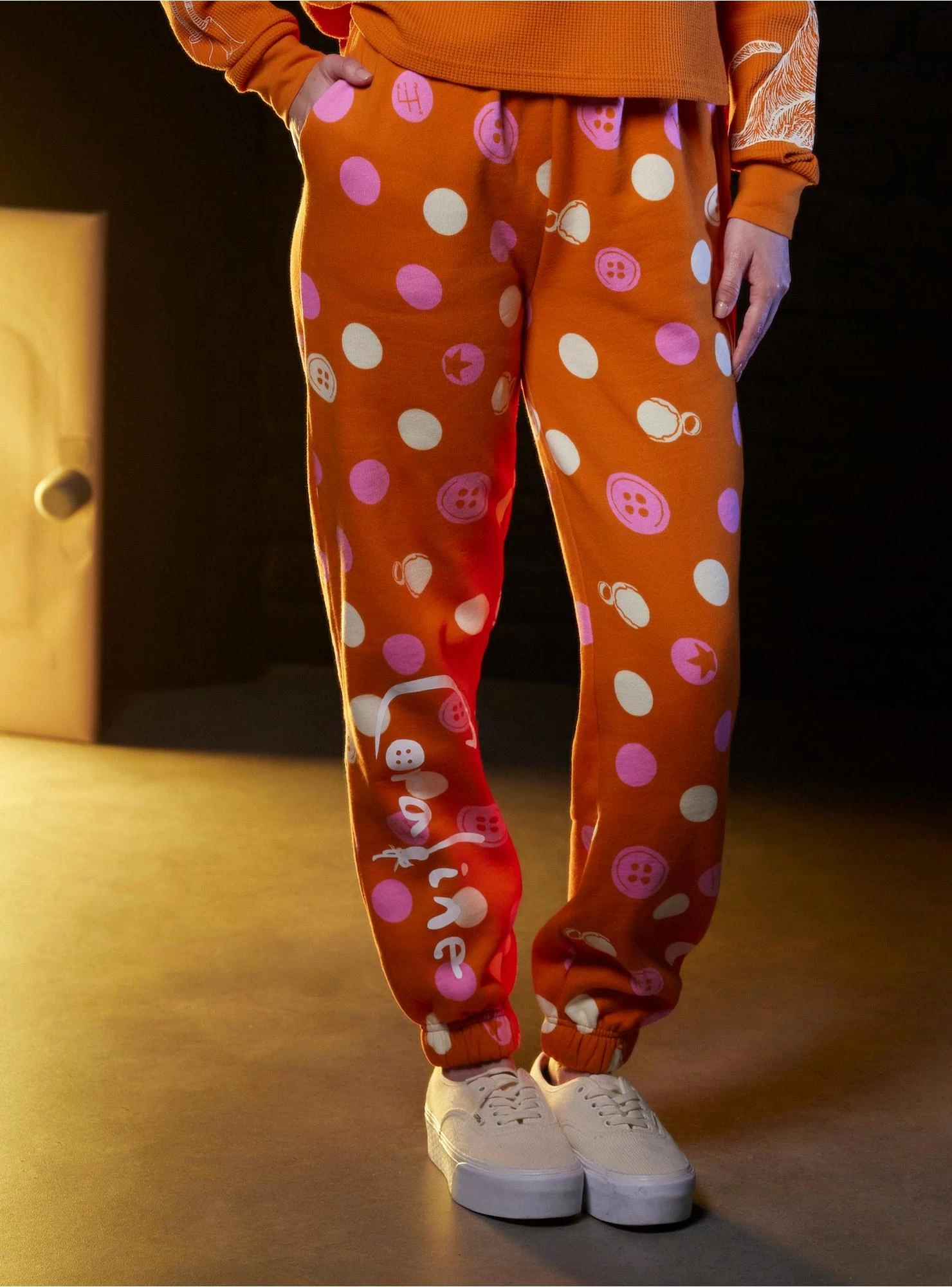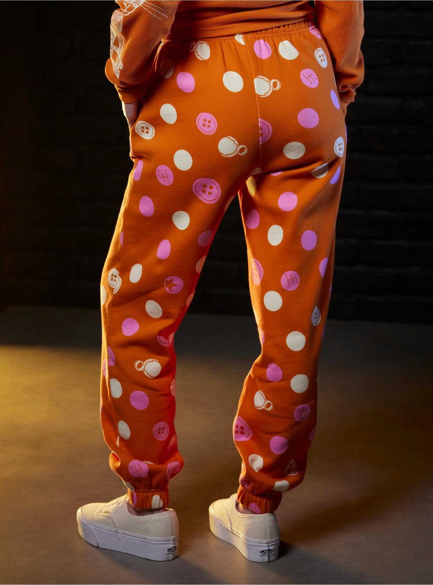 Take a break from the Other World in these comfy Coraline jogger sweatpants! It’s inspired by Coraline’s pajamas in the film with polka dots and other icons from the film all over. Comes with cinched ankles and pockets. Pair with the matching henley long-sleeve to complete your cozy look!