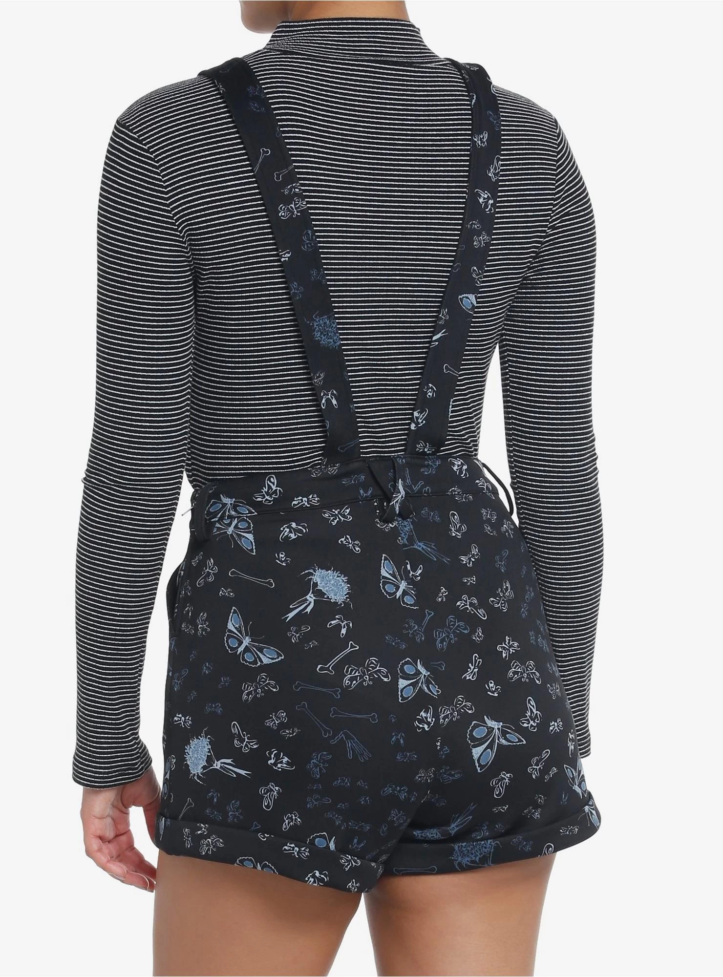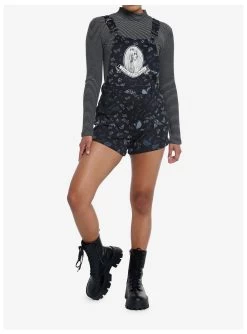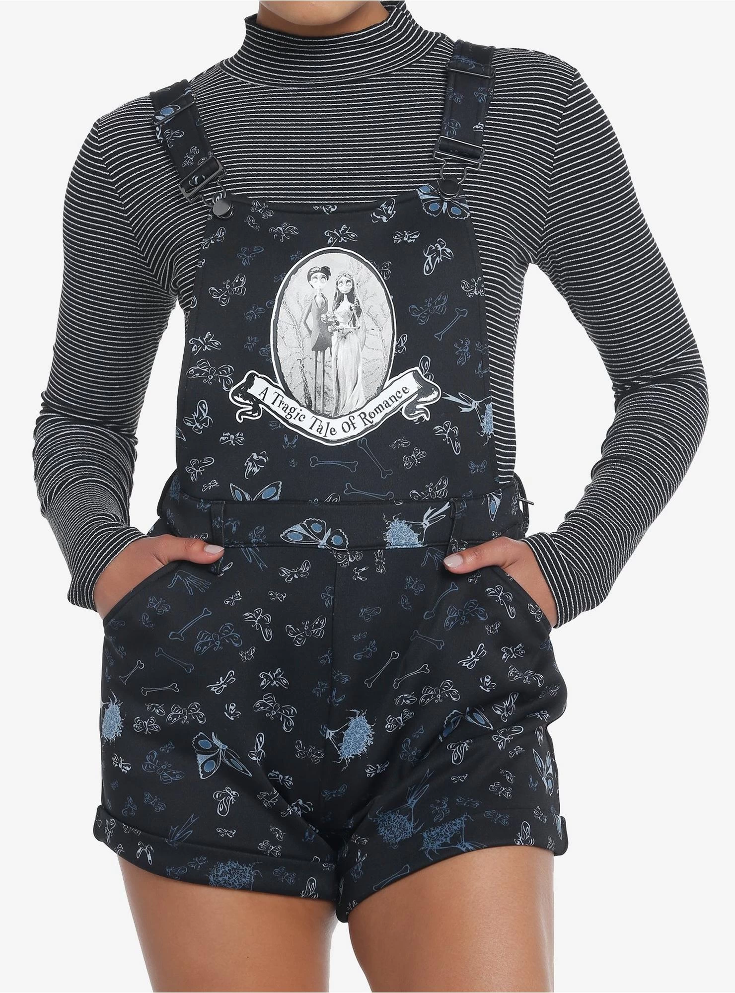 Let the tragic tale of romance from Corpse Bride infuse your next ‘fit with a bit of drama. These shortalls show a vintage-style portrait of Victor and Emily with “A Tragic Tale of Romance” written on a scroll below. They also have an allover print of insects and bones. Adjustable buckle straps, front pockets and side zipper.