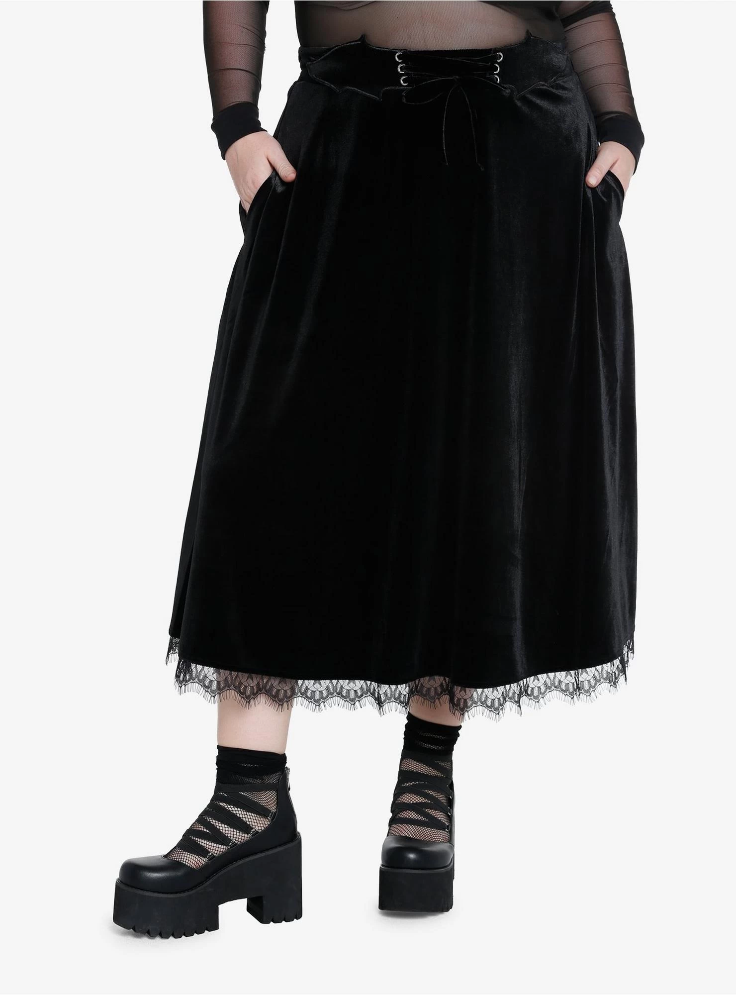Haunt what you got in this mystical, velvet midi skirt. Take your witchy ‘fit to a batty level with this piece, featuring bat wing and lace-up detailing at the elasticated waist. Comes with side seam pockets and lace trimming.
