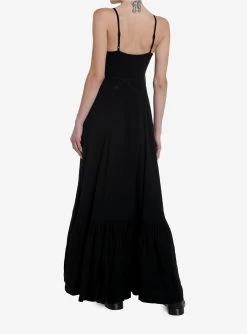 Hit the town looking like a gothic goddess in this black maxi dress! Features lace detailing around the waist, tiered skirt and front buttons. Comes with adjustable straps and side seam pockets.