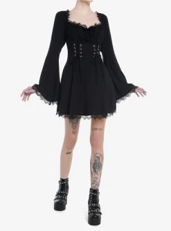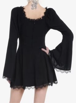 Get ready for your next coven meeting with this witchy black dress! Featuring lace-up detailing under the bust, plus lace trimming along the neckline, hem and bell sleeves. Comes with side seam pockets and a back zipper closure.