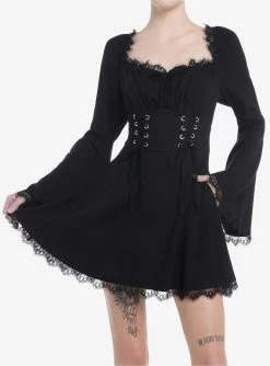 Get ready for your next coven meeting with this witchy black dress! Featuring lace-up detailing under the bust, plus lace trimming along the neckline, hem and bell sleeves. Comes with side seam pockets and a back zipper closure.