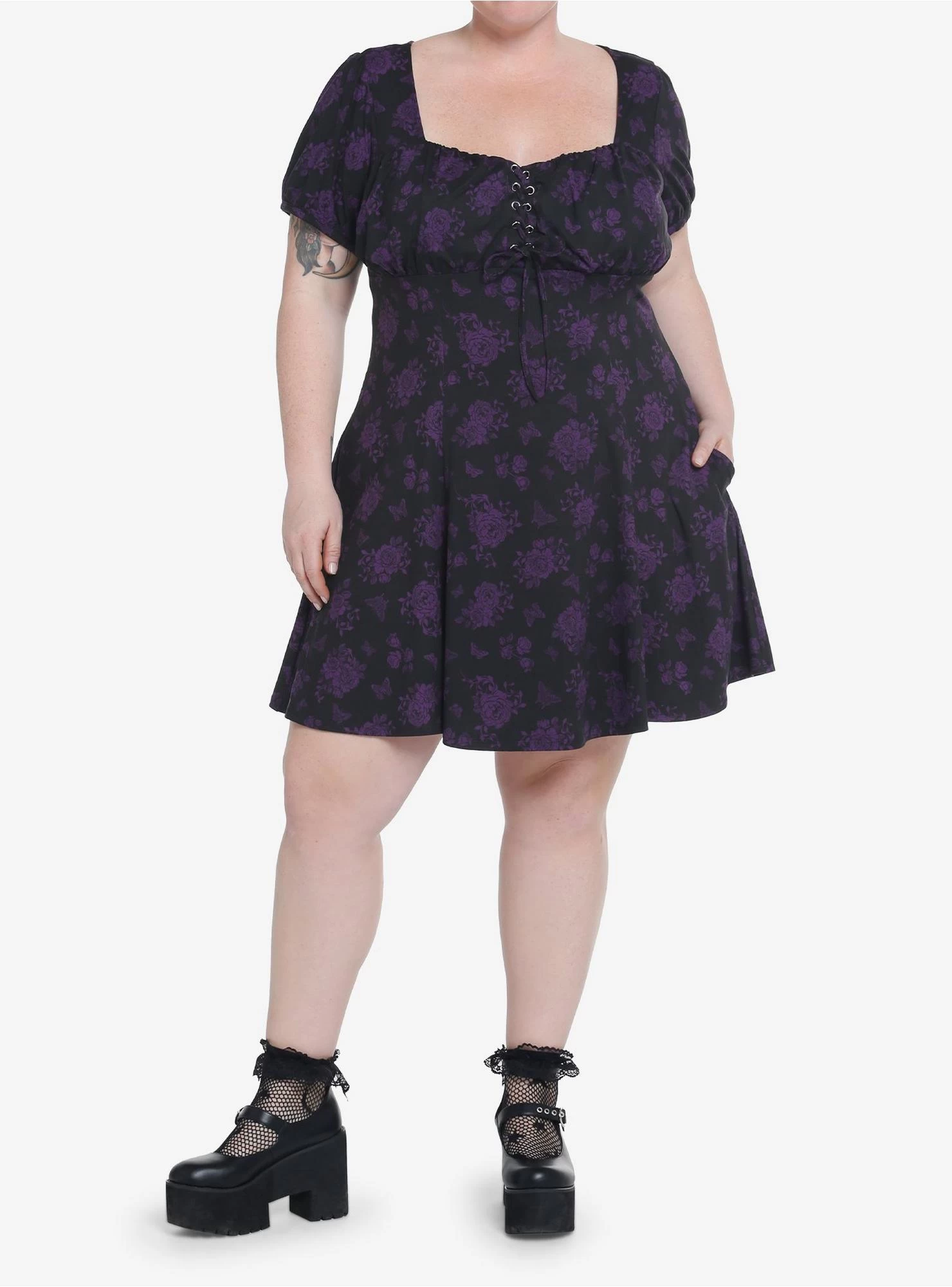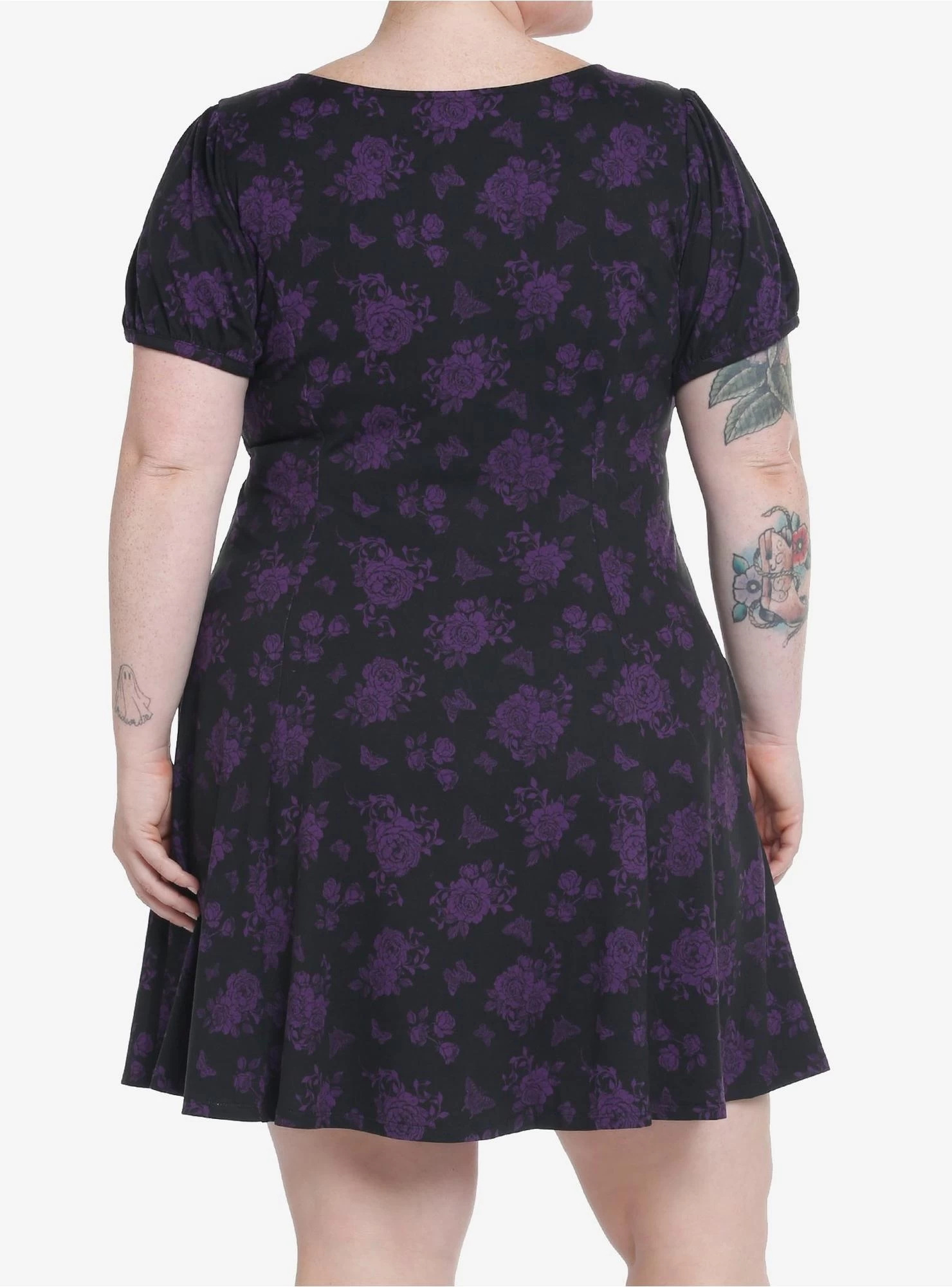 Bloom like a gothic beauty in this little number! This black dress features an allover deep purple print of roses and butterflies. Comes with puff sleeves, lace-up detailing at the bust and side seam pockets.