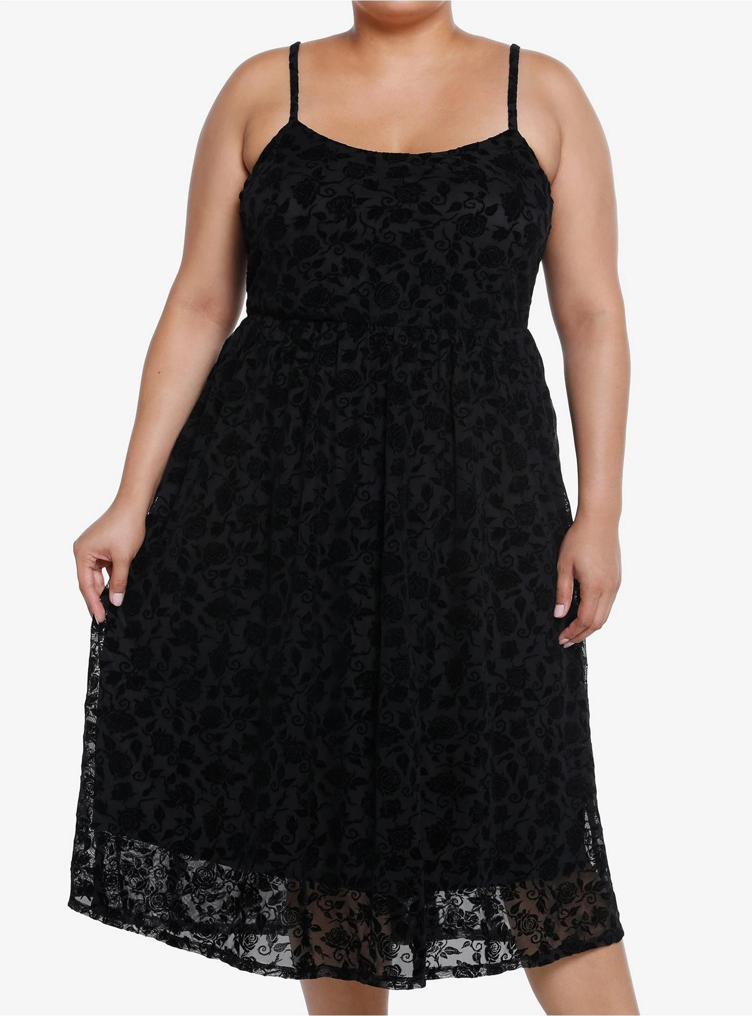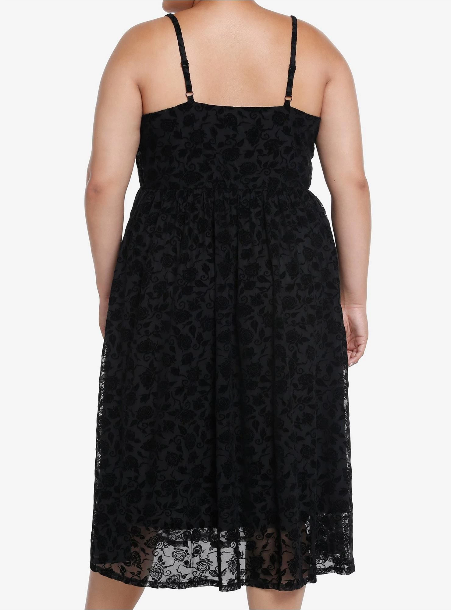 Cosmic Aura Black Rose Flocked Midi Dress Plus Size