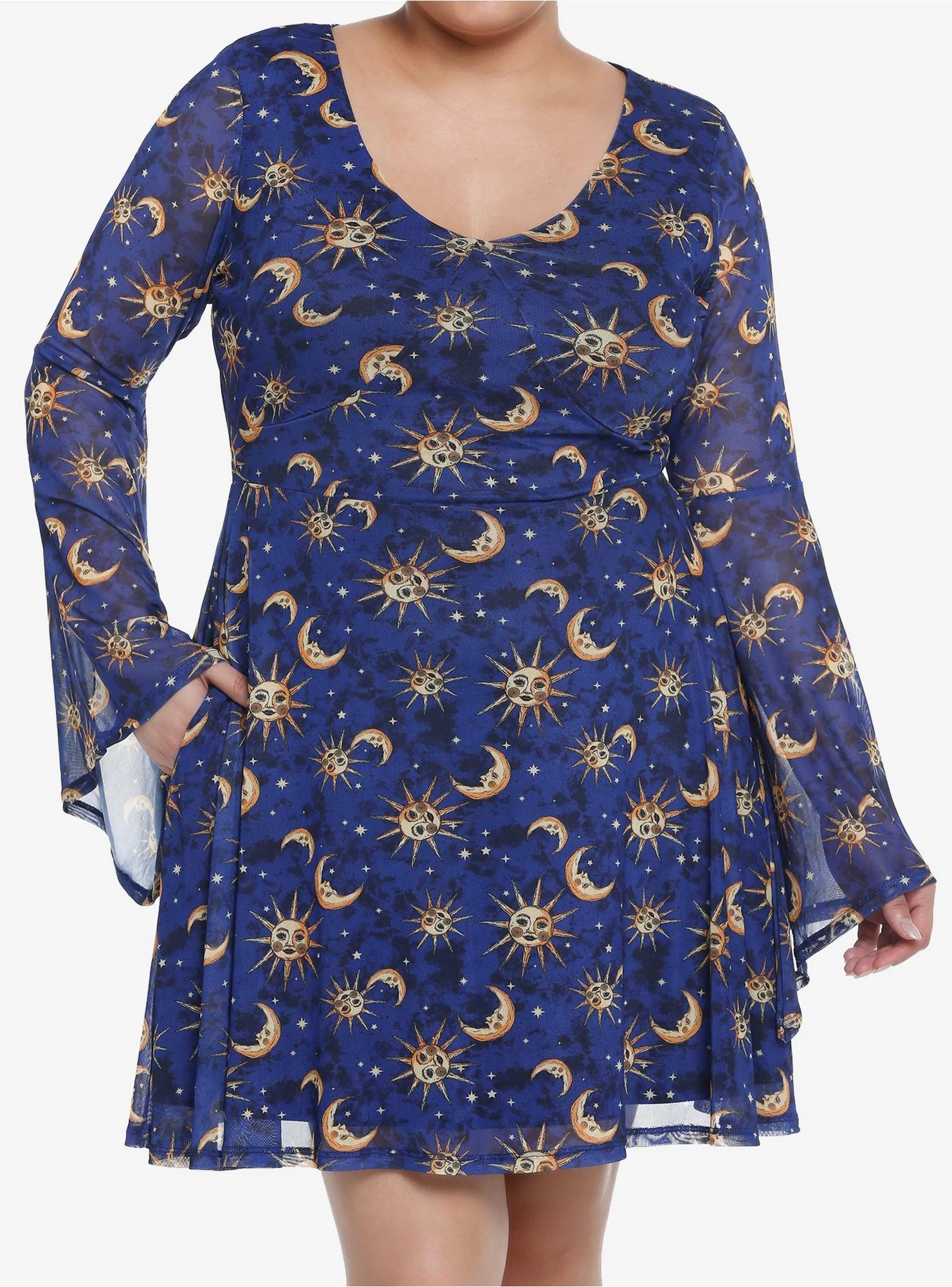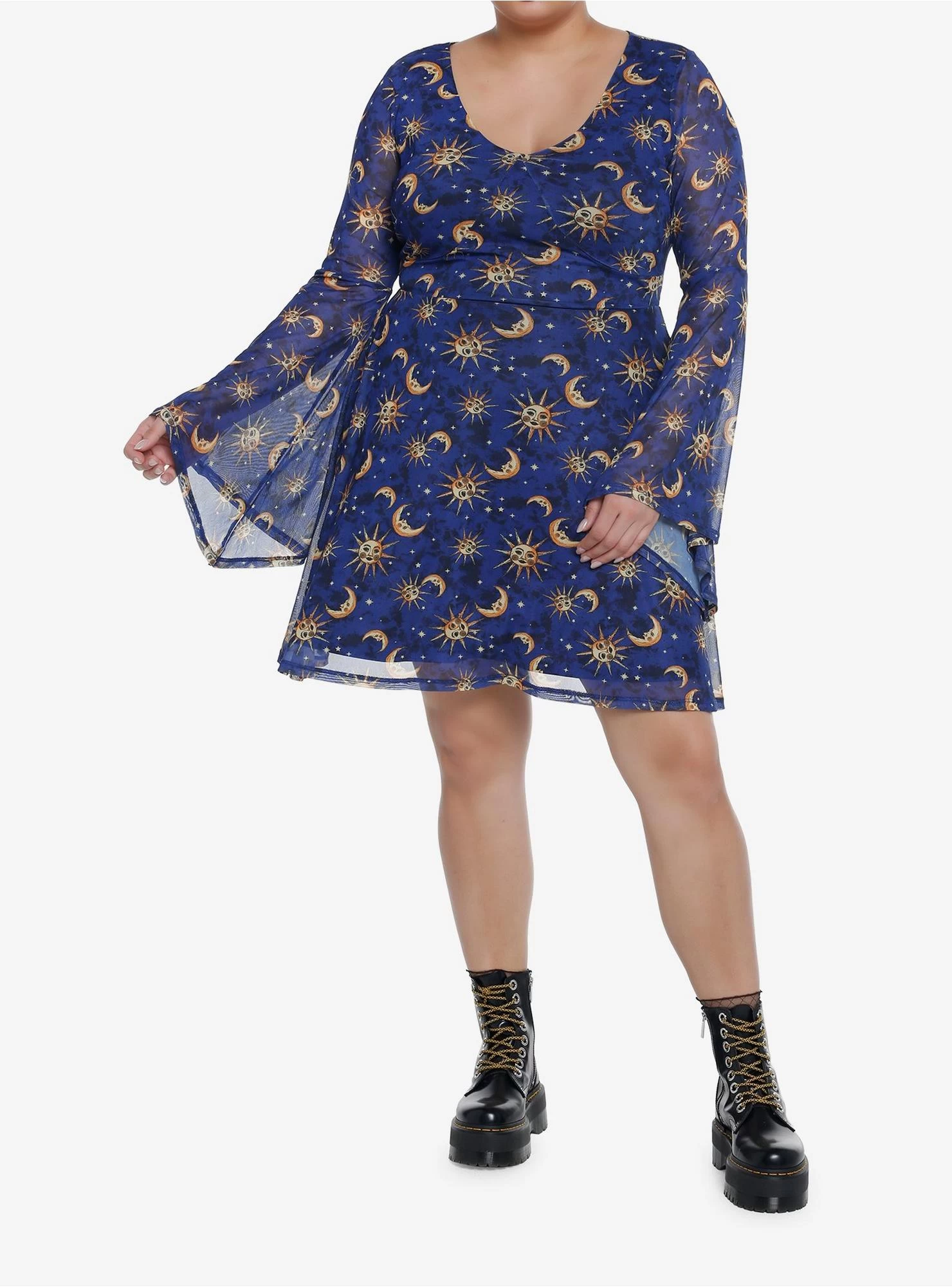 Elevate your look to cosmic levels with this witchy piece! This dress features a mesh layer with an allover sun and moon print. Comes with mesh bell sleeves and side seam pockets.