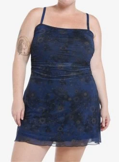 This fall is all about the whimsigoth look! This navy blue cami dress features a top mesh layer with an allover celestial print. Comes with ruching on the sides, a lettuce trim and adjustable straps.