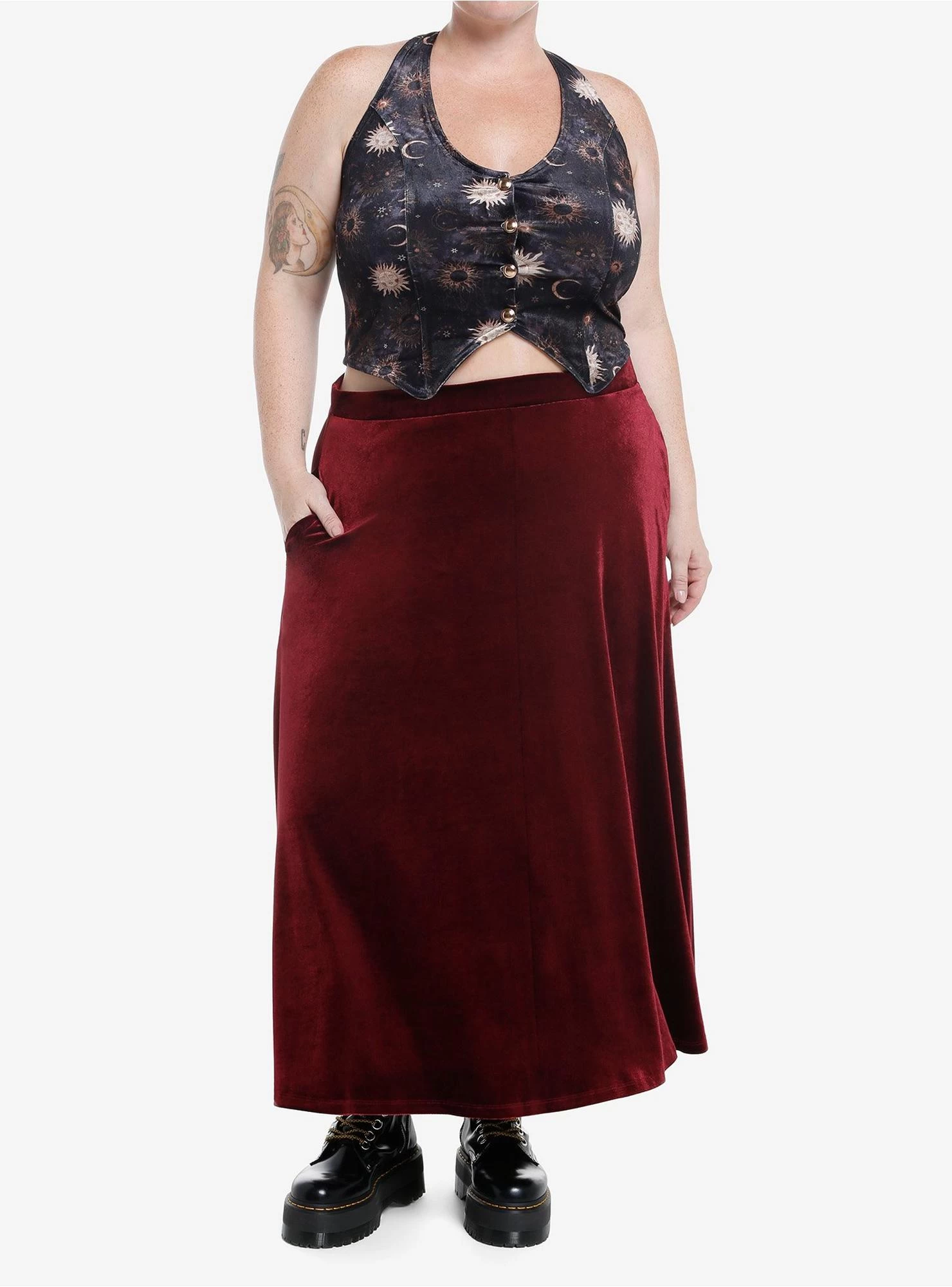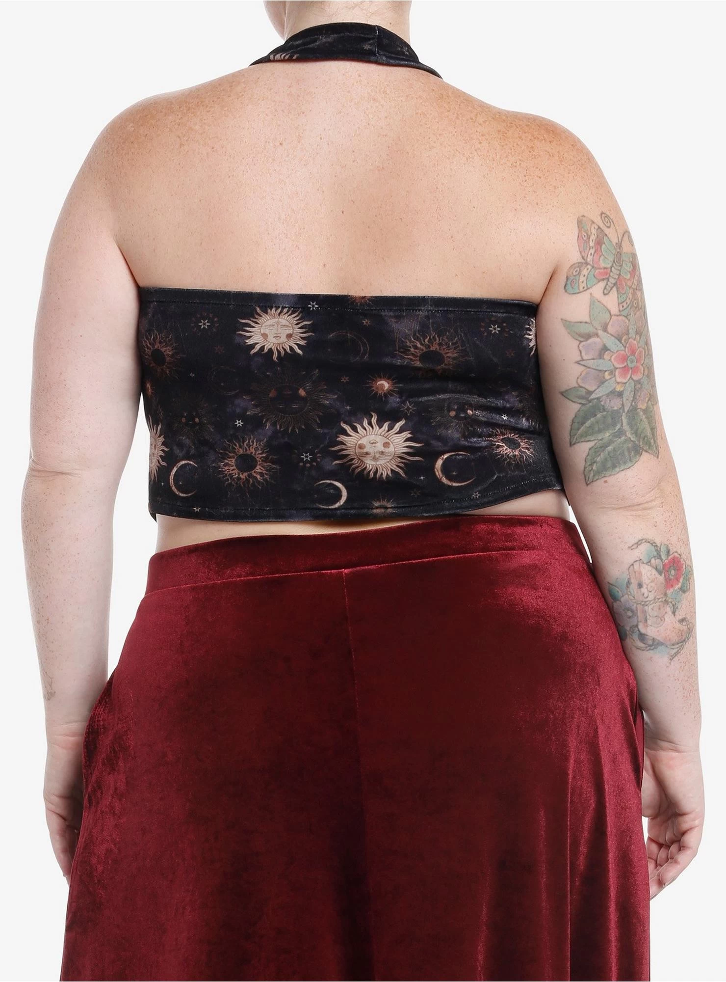 This season is all about those whimsigoth vibes! This velvet halter vest features an allover gold celestial design. Comes with a pointed hem and buttons down the front.