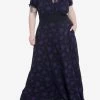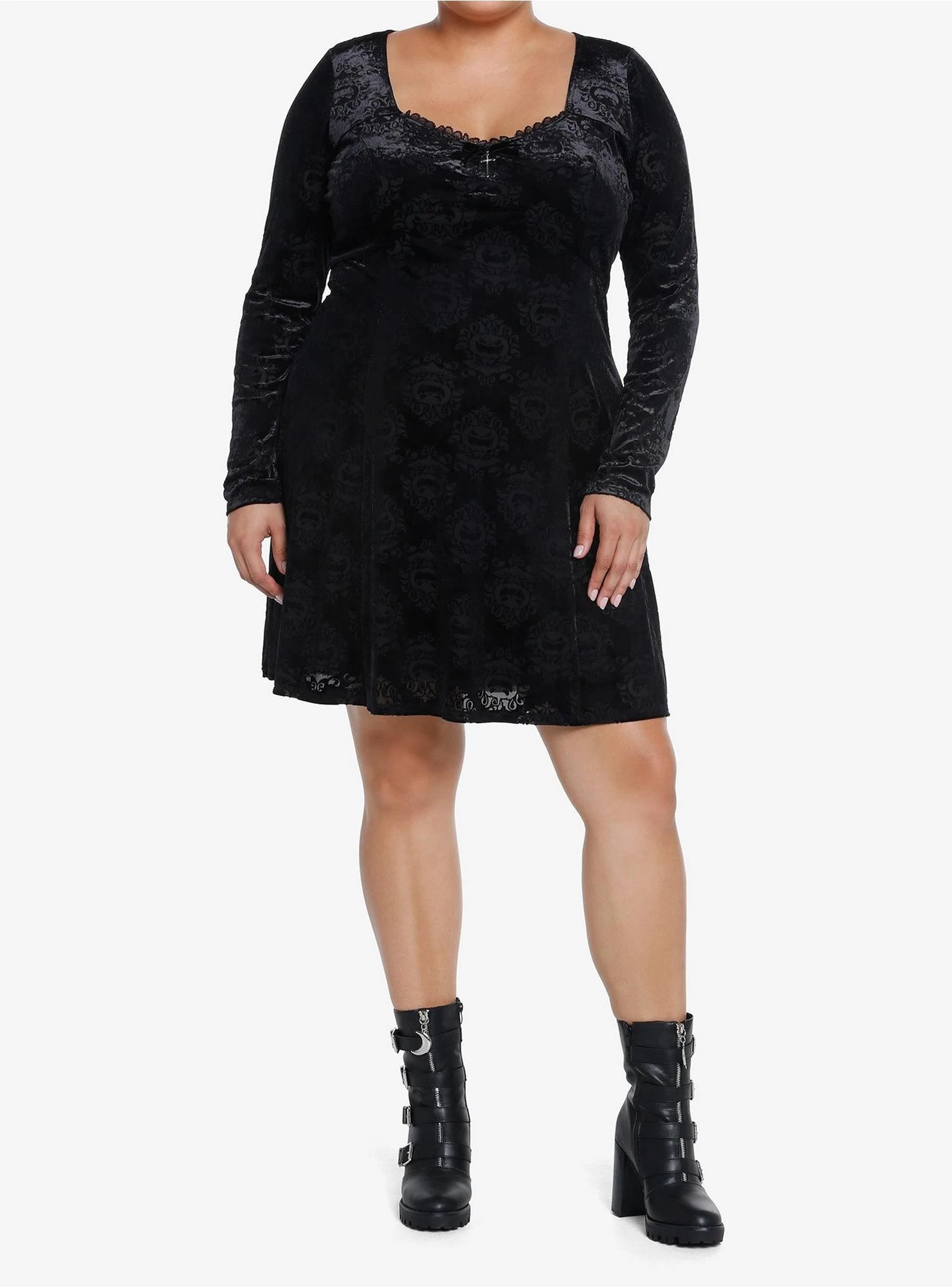 We’re going batty over this witchy piece! This black velvet dress features jack-o’-lantern and bat damask designs embossed throughout. Comes with a dainty cross charm at the chest and side seam pockets.
