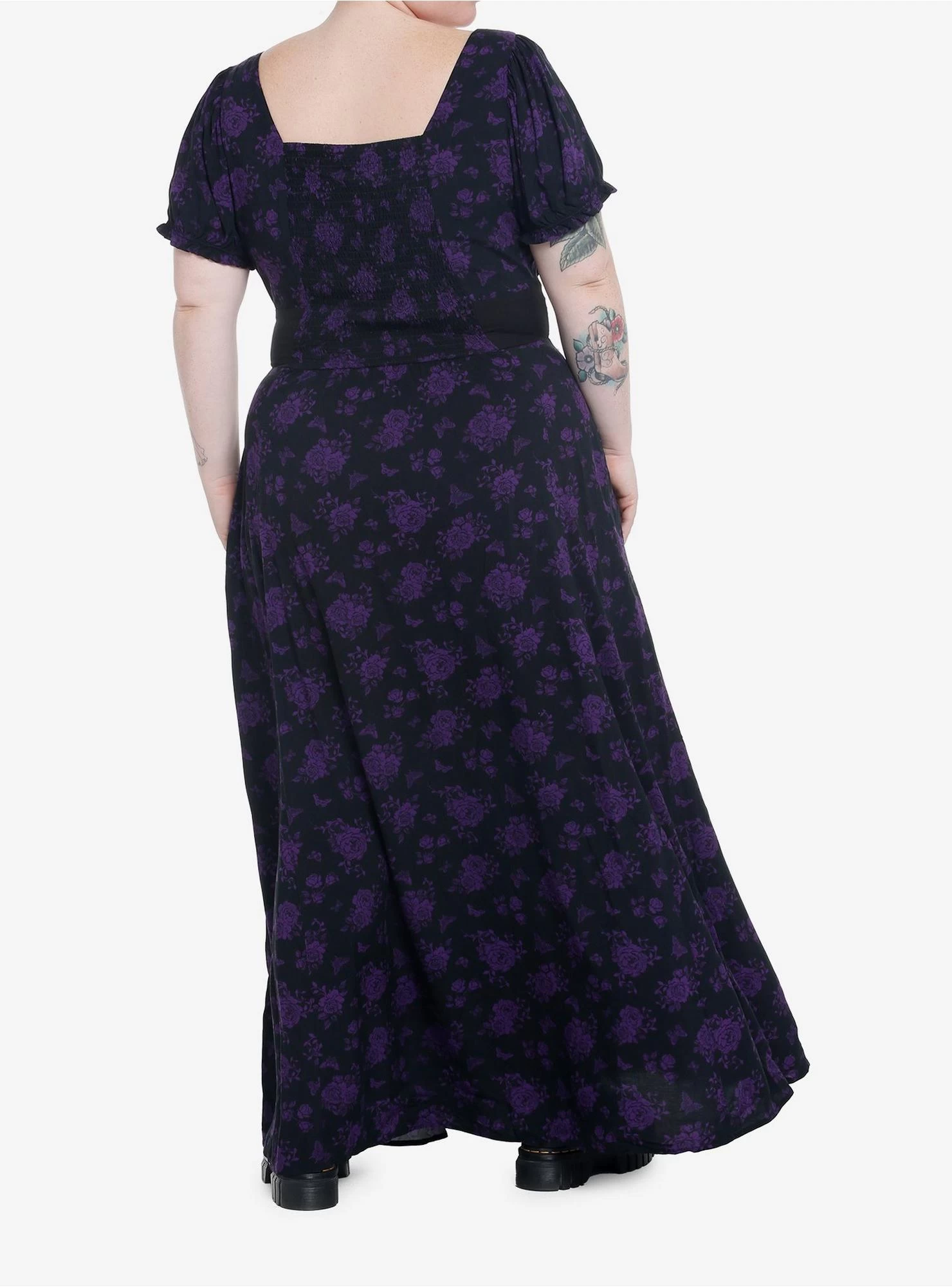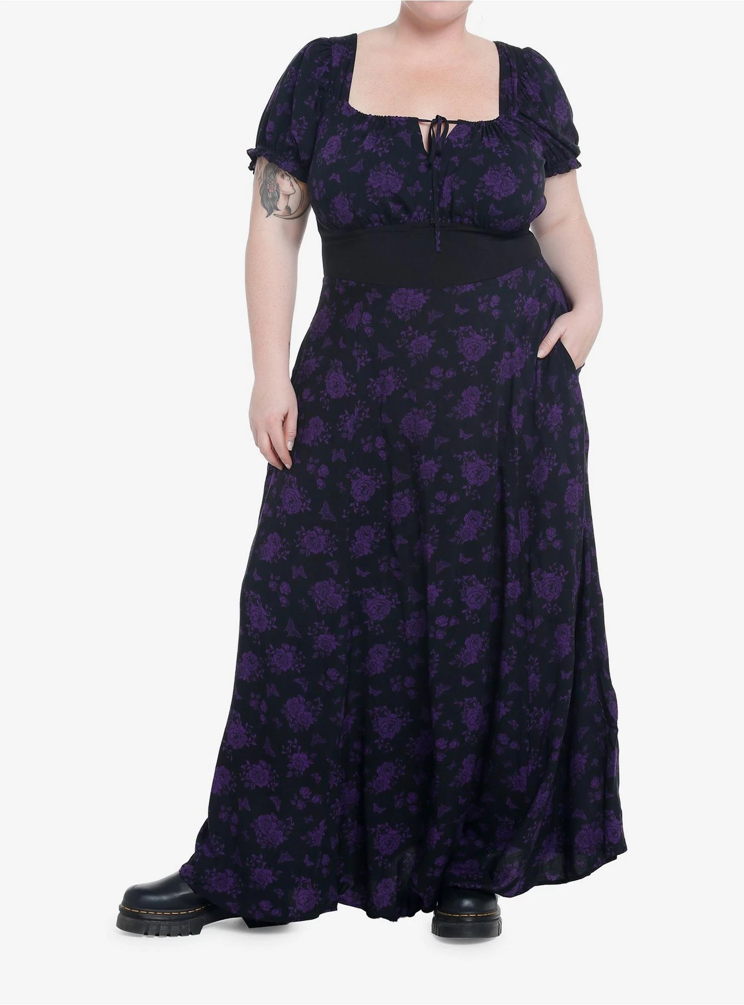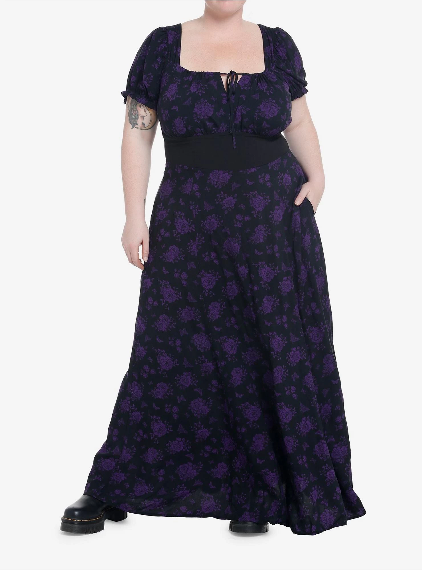 Bloom like a gothic beauty in this maxi dress! Features an allover purple rose and butterfly print and cinching at the waist. Comes with puff sleeves and side seam pockets.