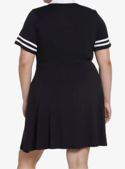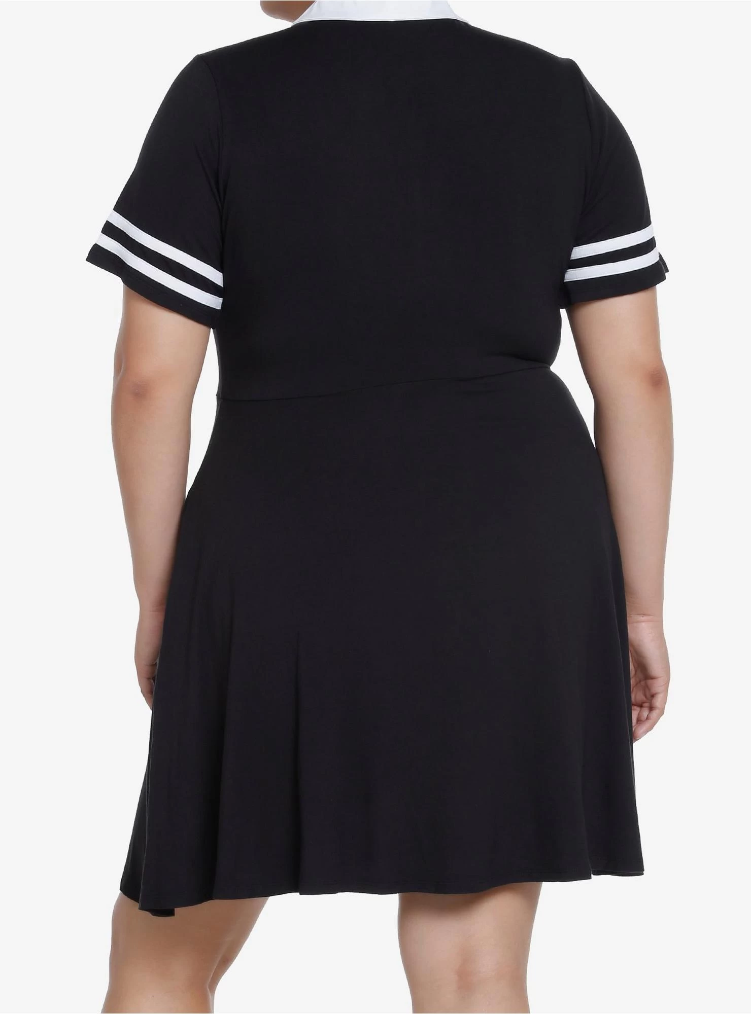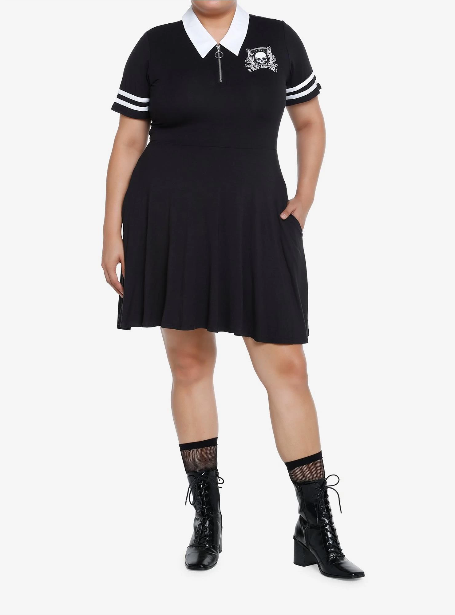 Prep meets punk in this adorable short-sleeve dress! This black polo dress features a contrast white collar and varsity stripes on the sleeves, plus a skull crest at the chest and a zipper pull detail down the chest. Comes with pockets!