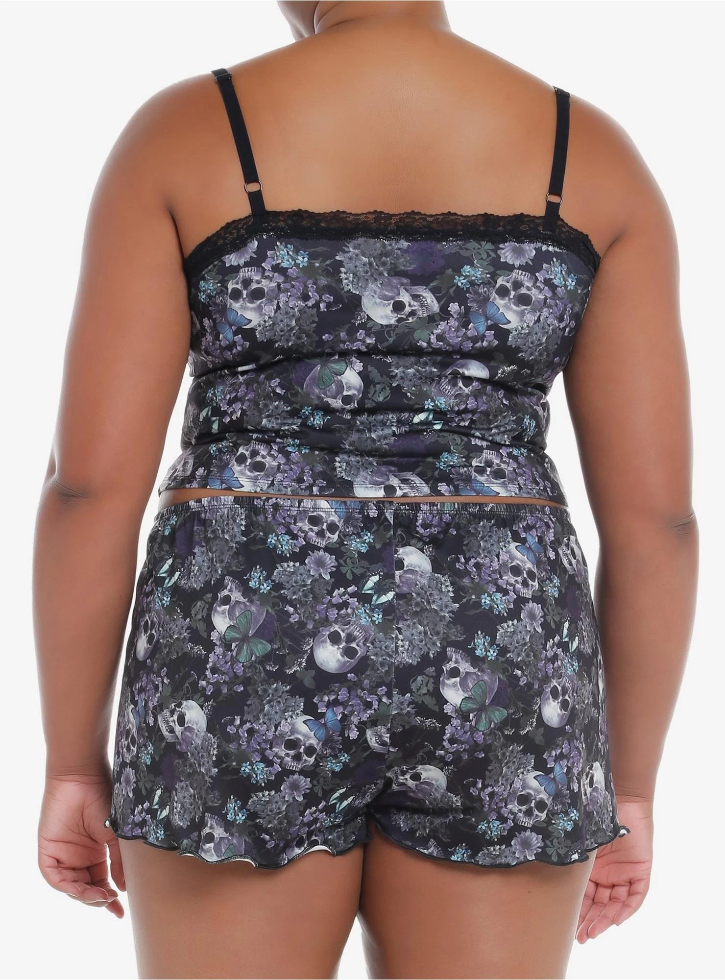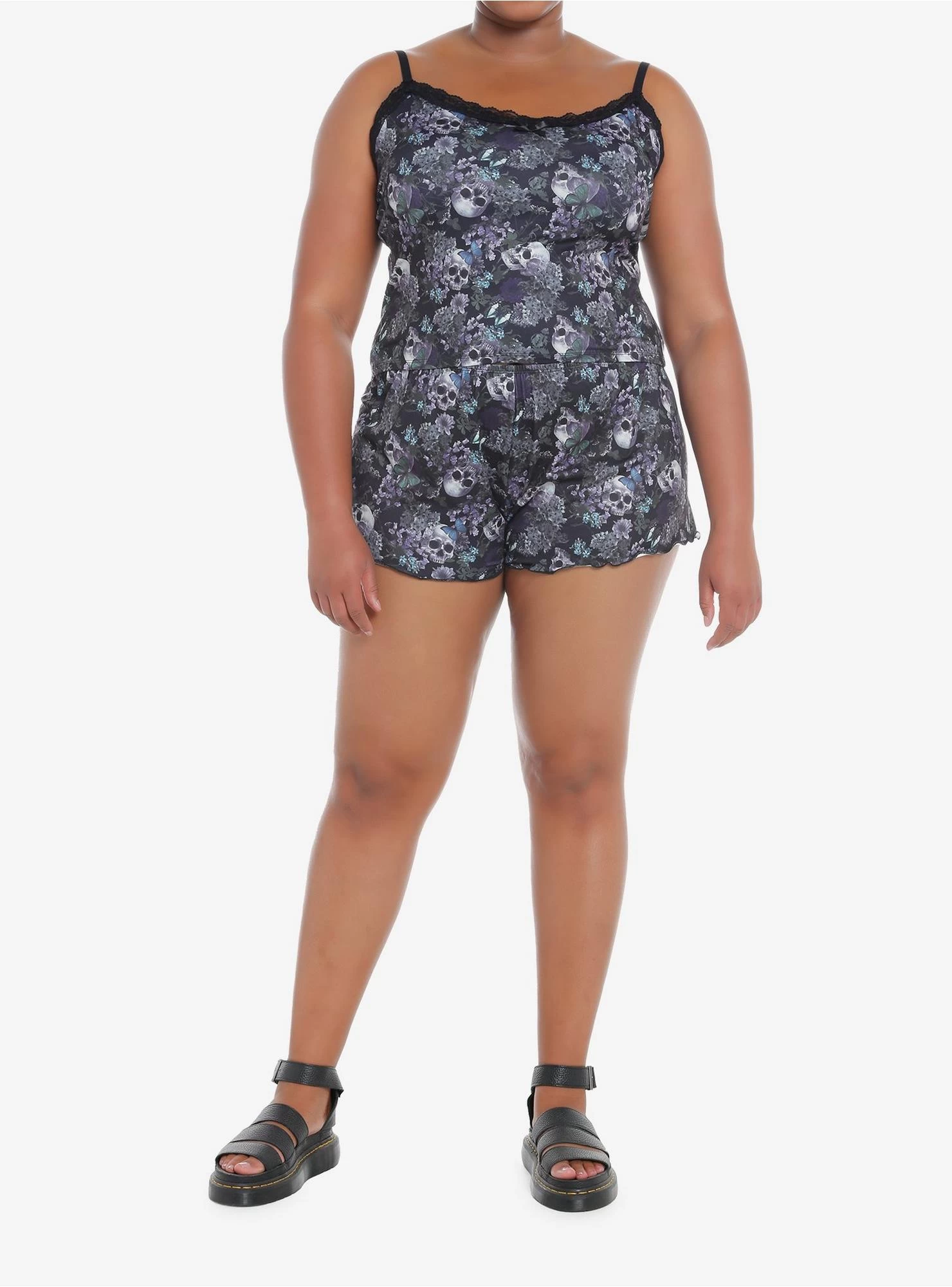 This lounge set is for the moody girlies! It has a black lace-trimmed cami top and shorts printed with skulls and dark flowers. The shorts have a lettuce hem and elasticated waistband. The cami straps are adjustable.