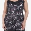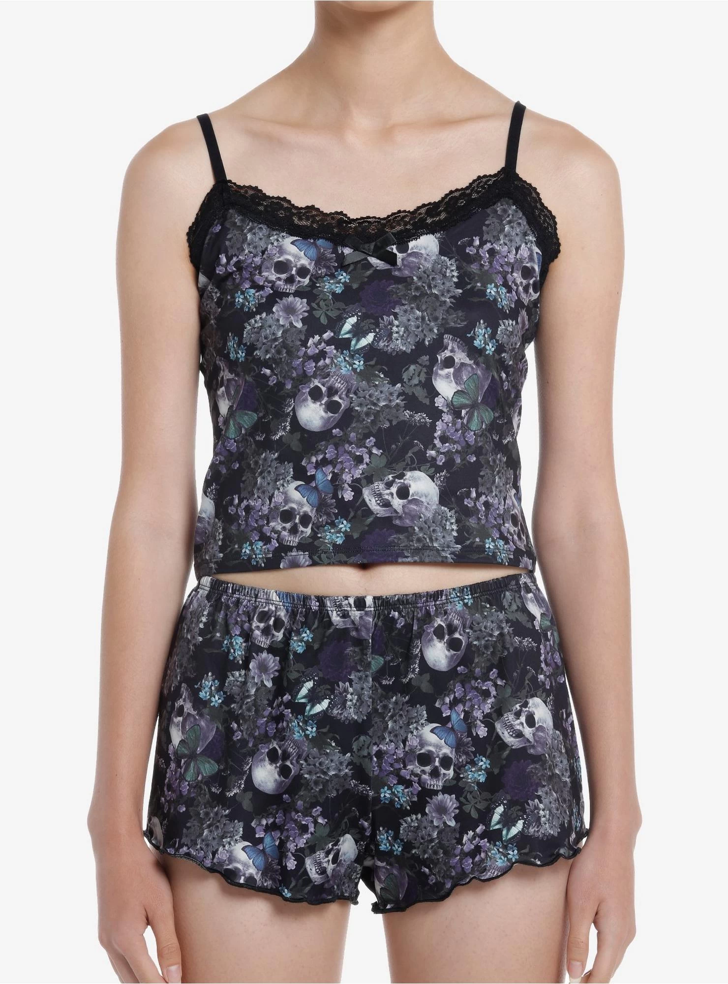 This lounge set is for the moody girlies! It has a black lace-trimmed cami top and shorts printed with skulls and dark flowers. The shorts have a lettuce hem and elasticated waistband. The cami straps are adjustable.