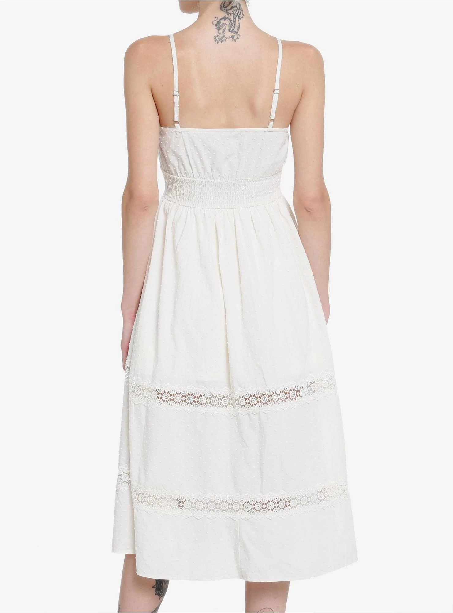 Keep your look as sweet as cream with this cami dress! This midi dress has texture all over, with strips of lace panels around the skirt, smocking around the waist and tie-front strings at the neckline. Comes with adjustable cami straps.