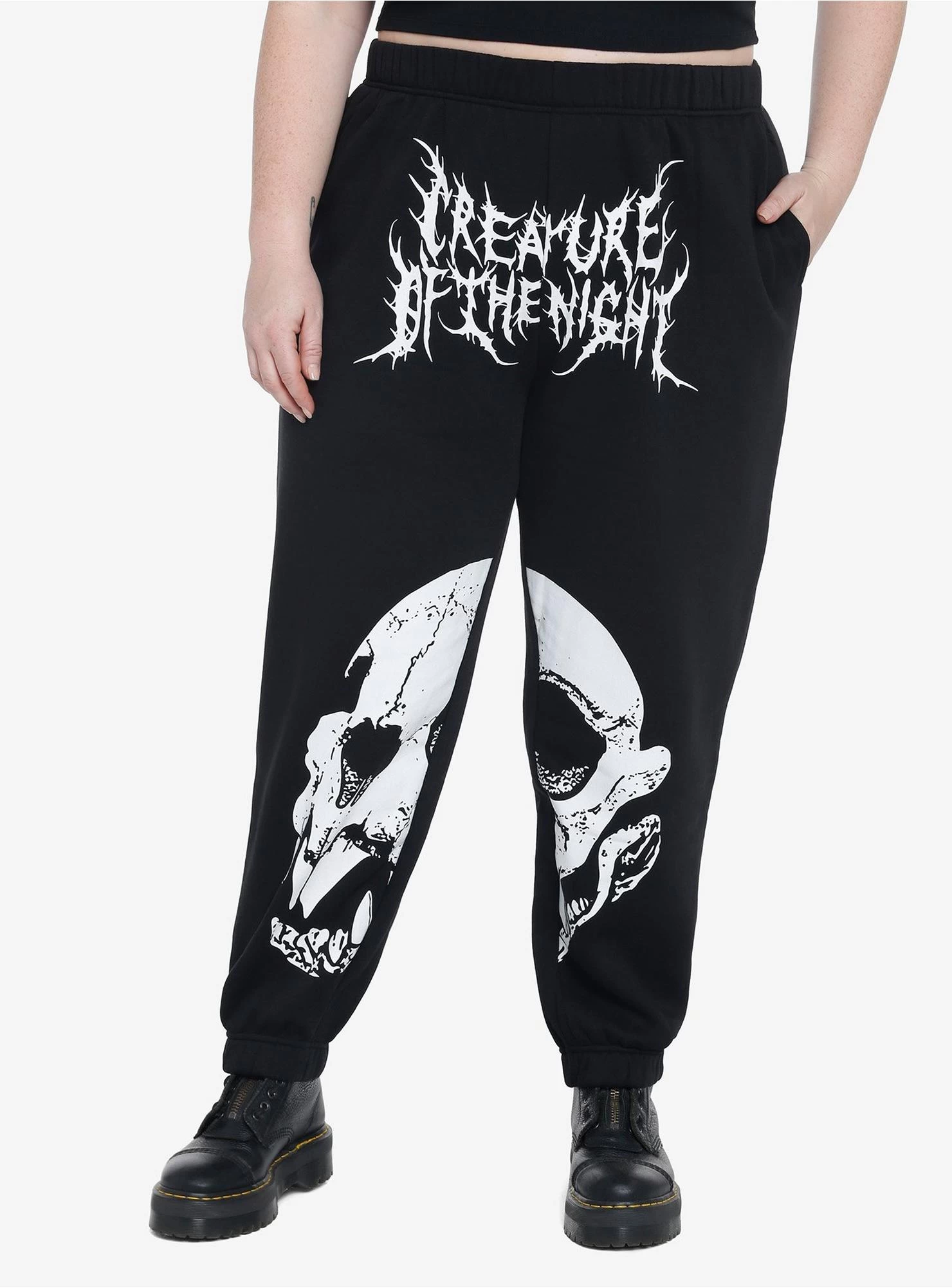 Heading out to be a creature of the night? Stay warm and cozy with these jogger sweatpants! Features a large print of an animal skull across both legs, with “Creature of the night” in a heavy metal-inspired font across the top. Comes with an elasticated waistband, cinched ankles and pockets.