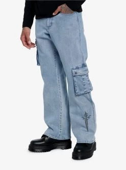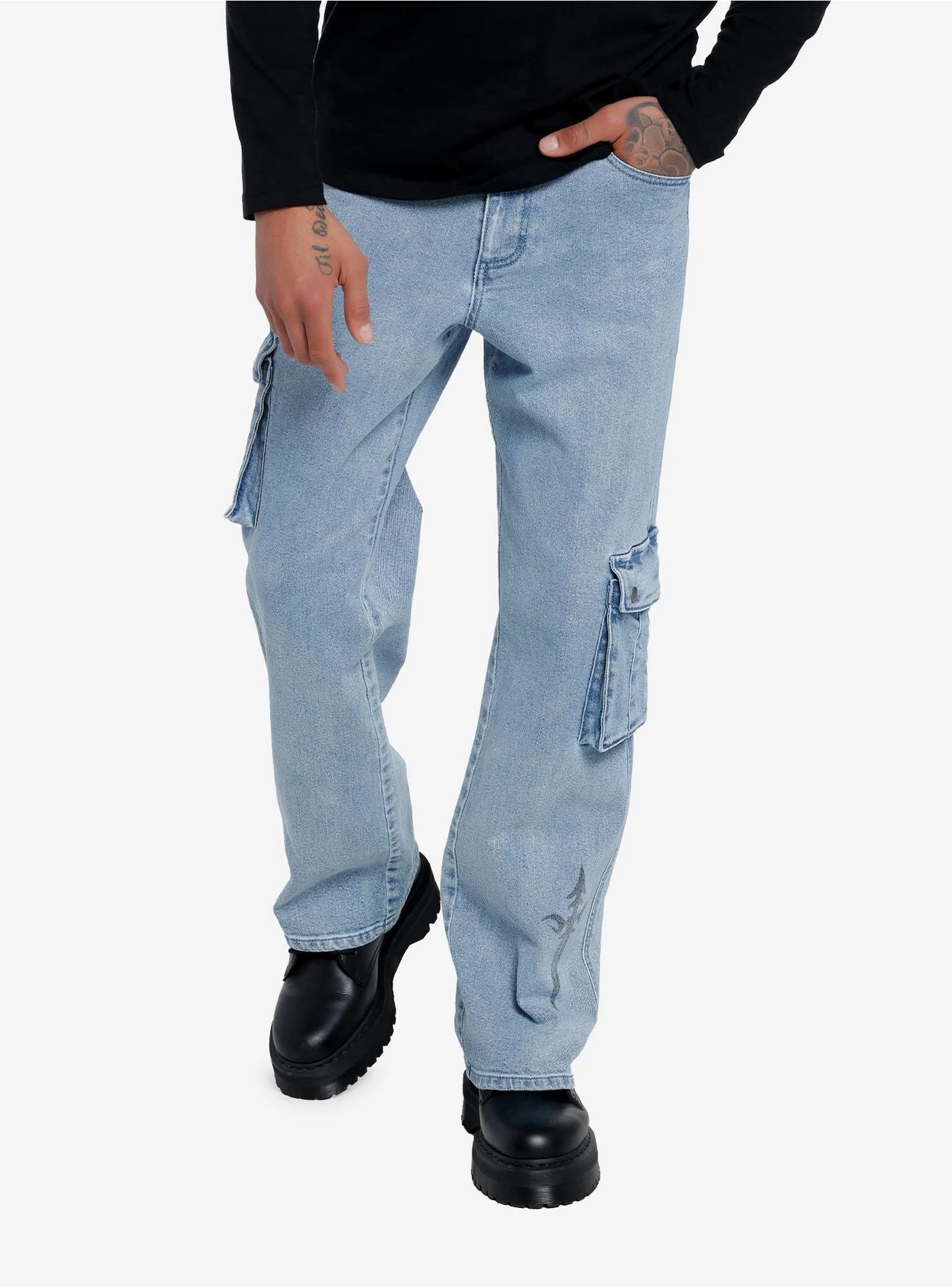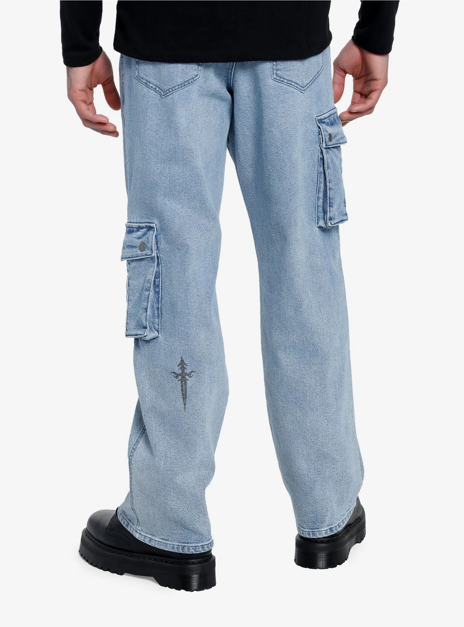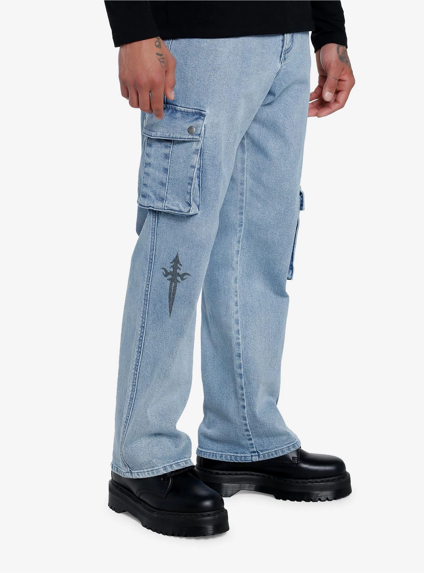 Stay lookin’ sharp with this denim pants! They feature faded dagger artwork on the legs, plus cargo pockets with snap-button closures.
