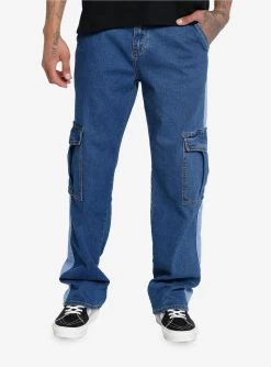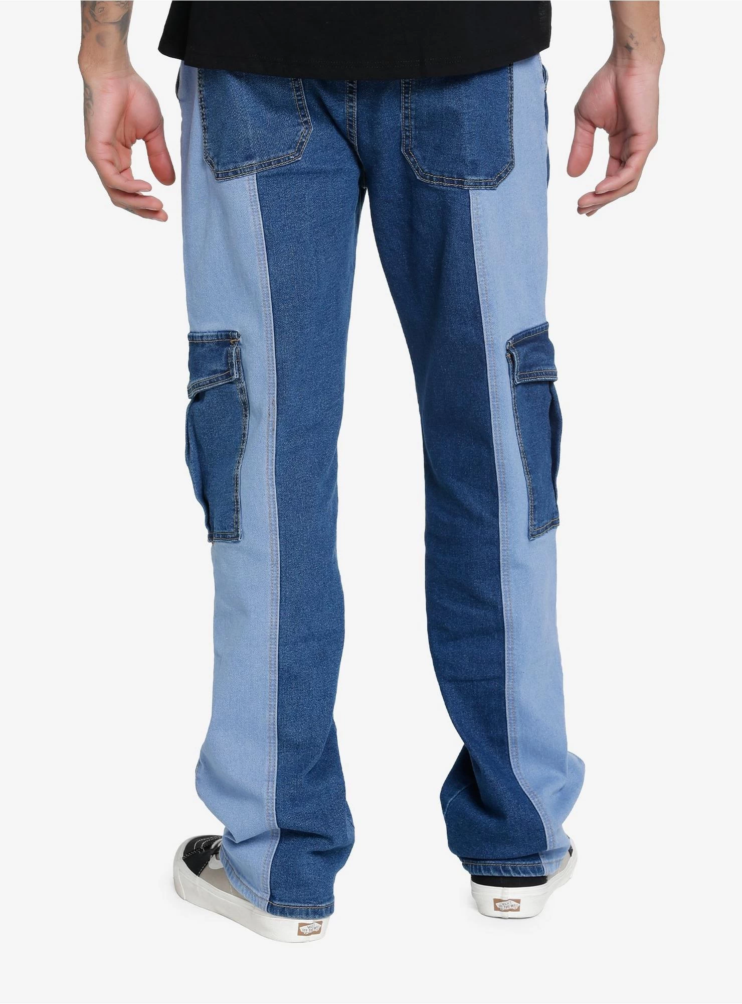 Light and dark denim — now you don’t have to choose. This pair of cargo pants is a darker indigo denim on the front, and light blue denim on the back, with cargo pockets on the side.
