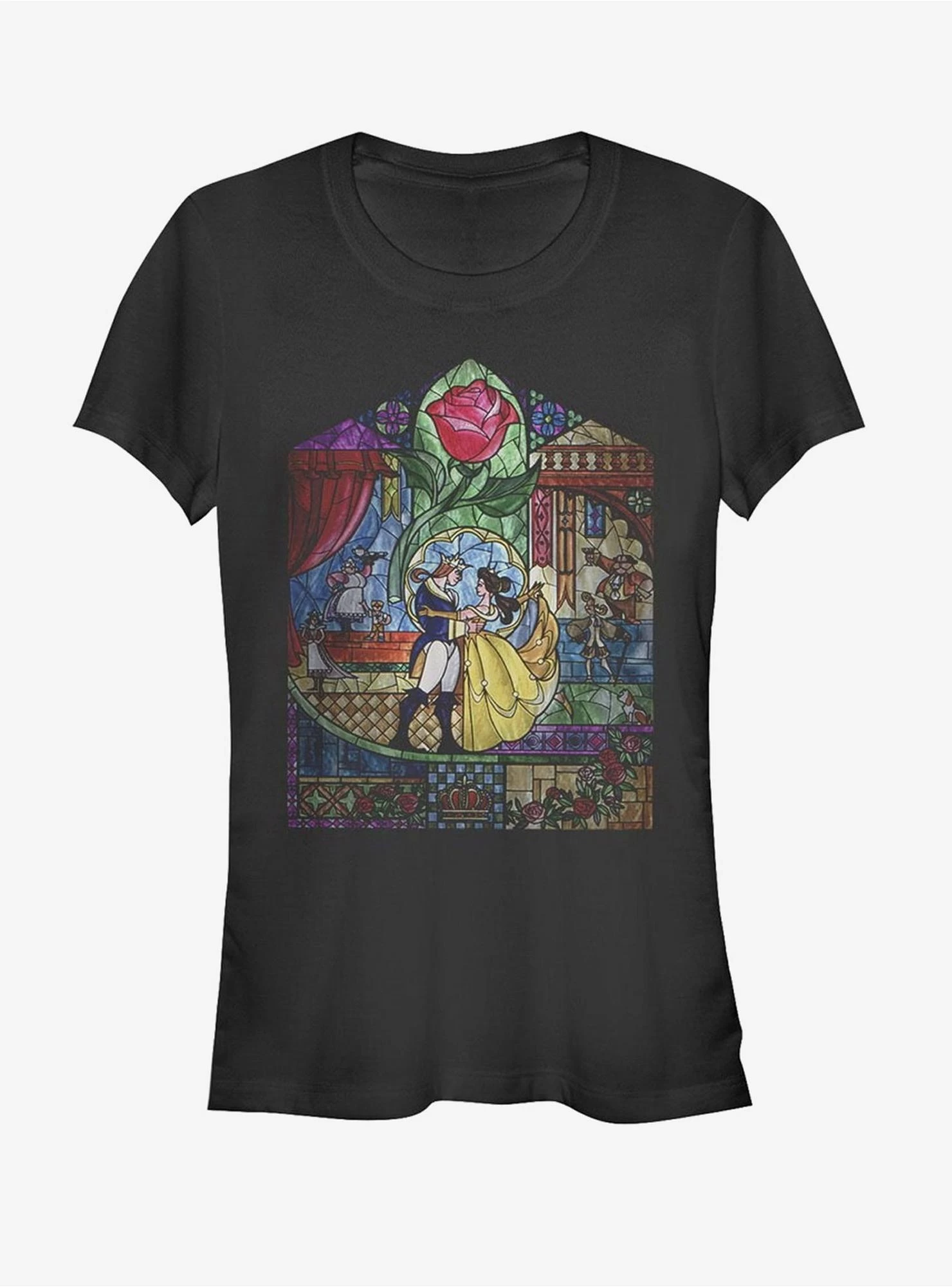 A beautifully-detailed stained glass styled graphic of Belle and her prince graces the front of this fitted black T-shirt from Disney’s Beauty and the Beast.