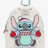 Ready for a fun day with Stitch? Pack your peanut butter sandwiches and everything else you need in this Lilo & Stitch mini backpack. Printed with a blue tropical leaf pattern, with Stitch on the front pocket. Featuring a front zipper pocket, adjustable straps, carrying handle, top zipper closure and internal zipper pocket.