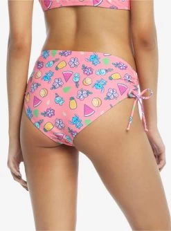 Enjoy a fun day in the sun with Stitch and your ohana! These pink swim bottoms feature a toss print of flowers, fruit, Scrump and Stitch, with cinching at the hip. Pair with the matching top to complete your beach day look!
