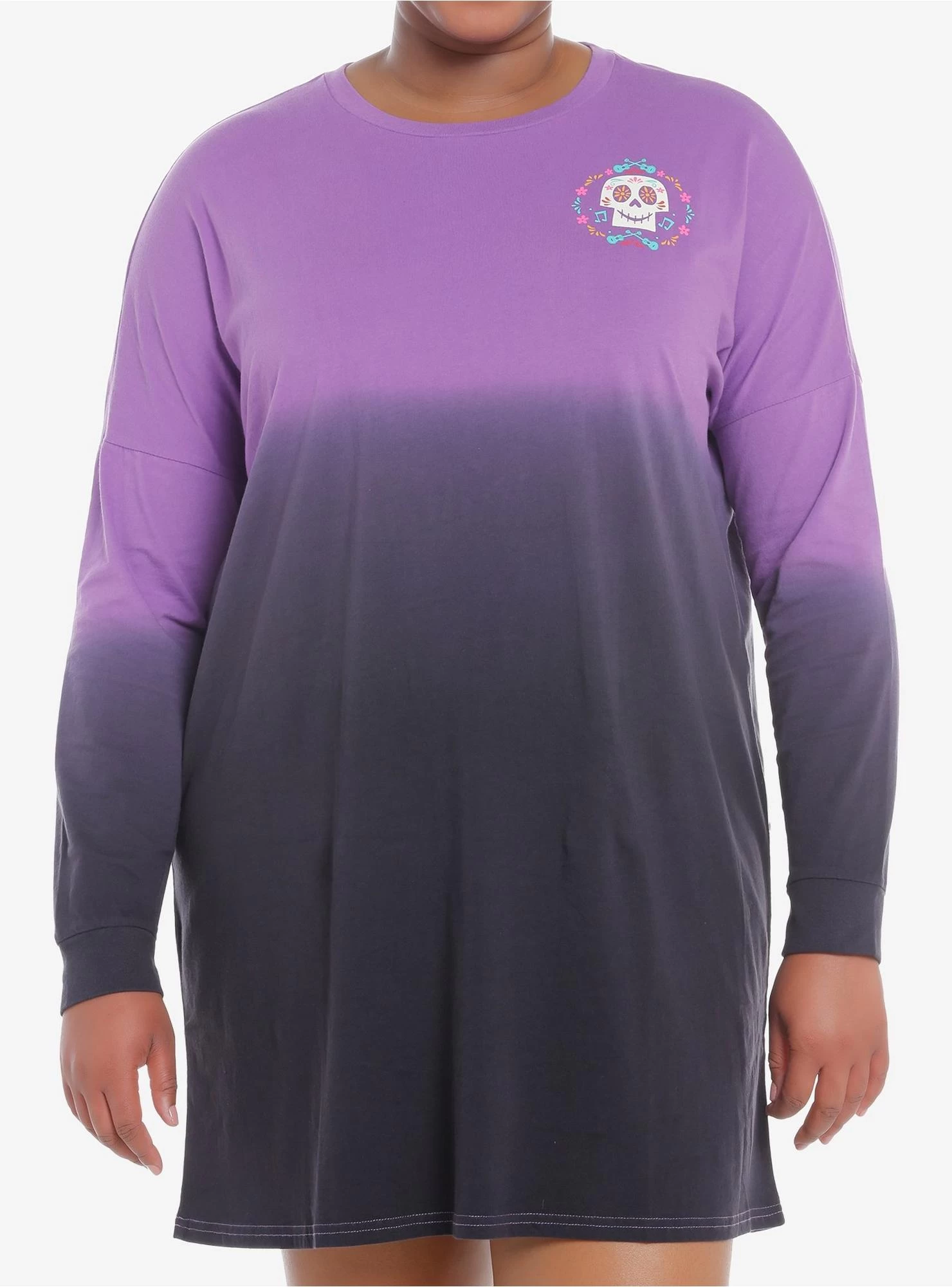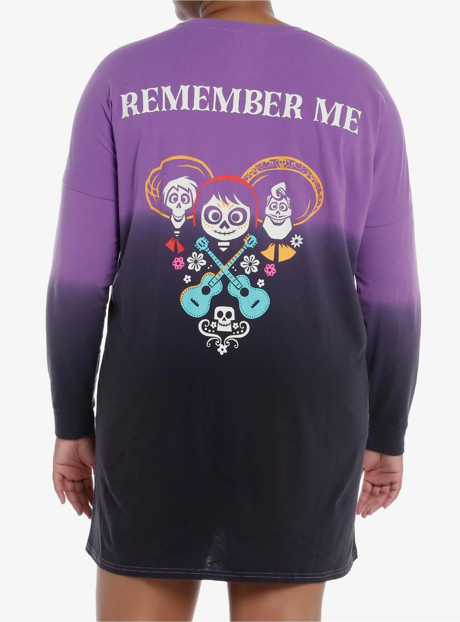 Get the perfect outfit for your trip to the Land of the Dead with this Coco athletic jersey dress! Featuring an ombrรฉ purple and black design with a sugar skull at the chest. Peep the back to see “Remember me” printed above skeleton versions of Miguel, Hector and Ernesto de la Cruz.
