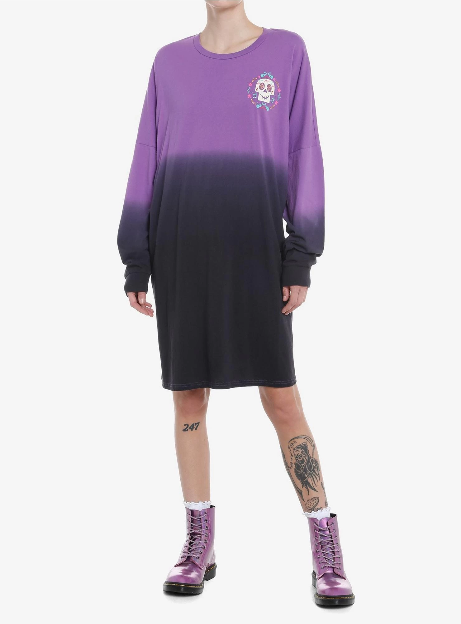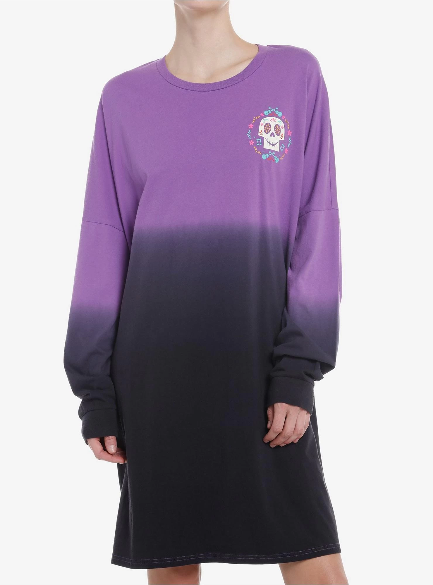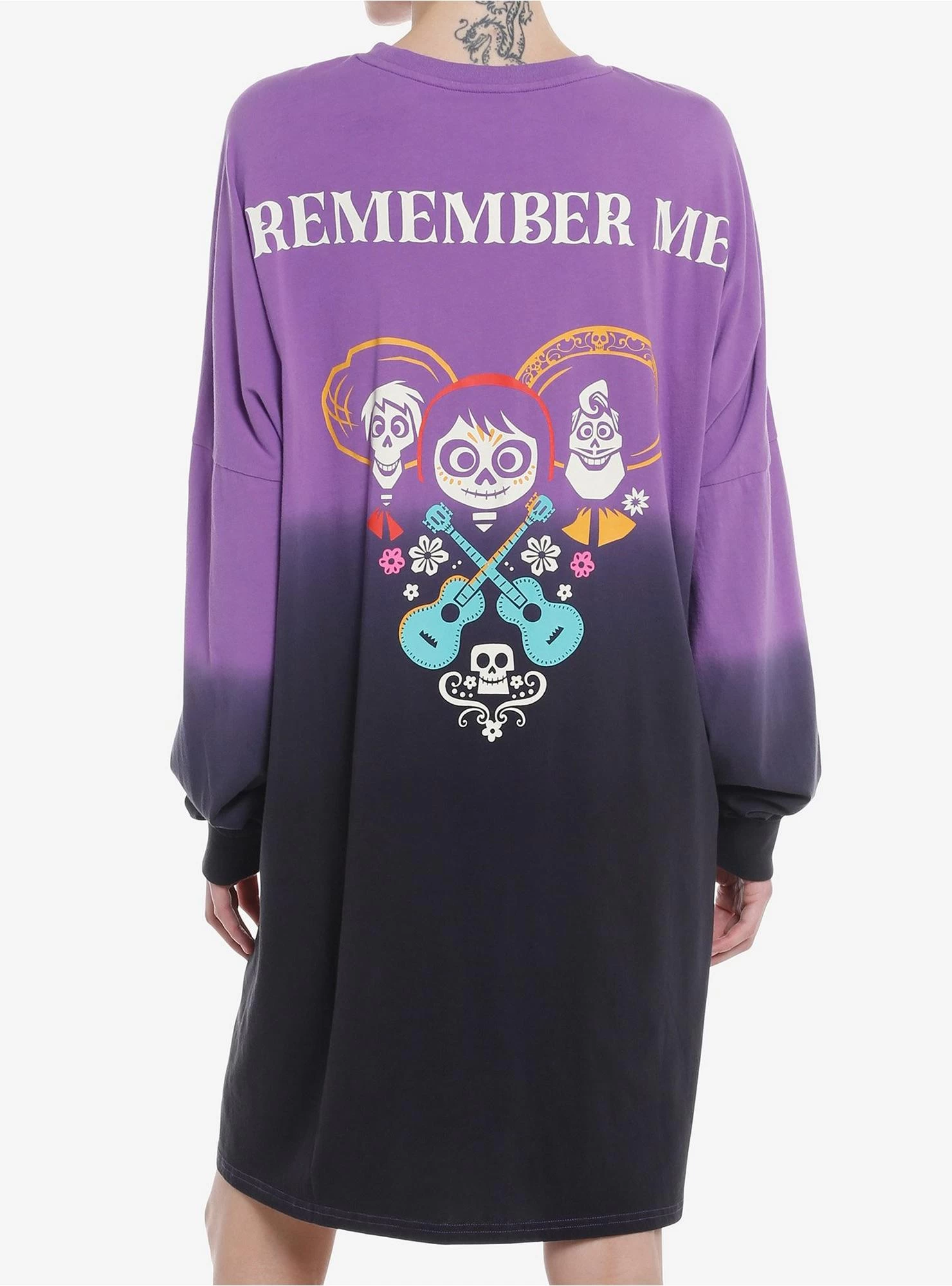 Get the perfect outfit for your trip to the Land of the Dead with this Coco athletic jersey dress! Featuring an ombrรฉ purple and black design with a sugar skull at the chest. Peep the back to see “Remember me” printed above skeleton versions of Miguel, Hector and Ernesto de la Cruz.