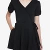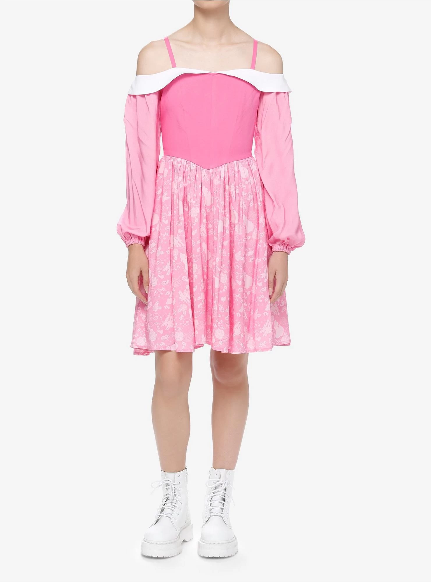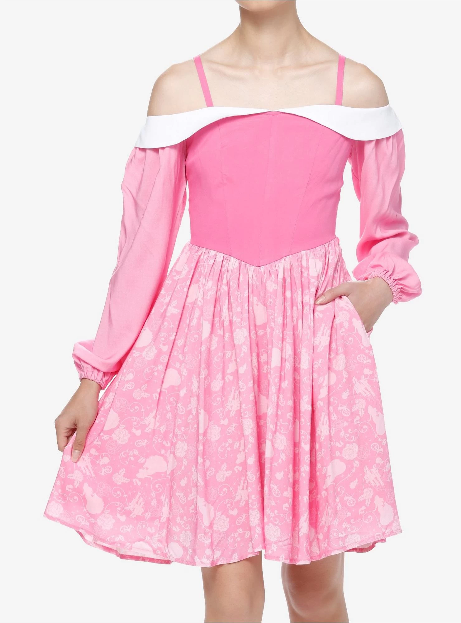 This pink off-the-shoulder dress is inspired by the enchanting-but-sleepy Disney Princess Aurora, from Sleeping Beauty. The lined skirt is printed with different silhouettes and symbols from the film, and the shoulder straps are adjustable. There are also pockets!