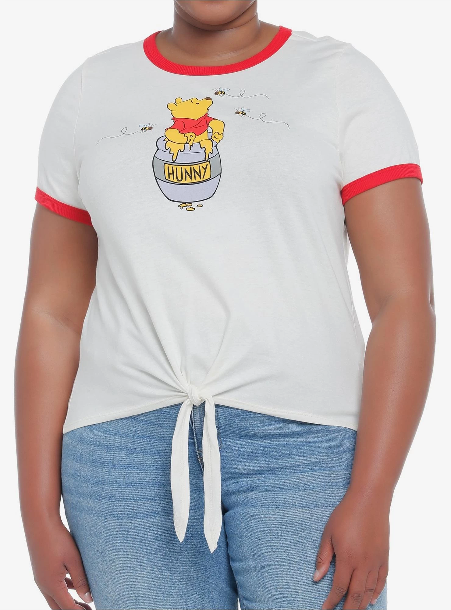 Oh, bother! Got hunny all over your last shirt? Add some Hundred Acre Wood style to your wardrobe with this ringer tee! This Winnie the Pooh shirt features your favorite silly old bear sitting in a pot of hunny, and comes with tie-front detailing and red contrast ringer hem on the sleeves and neckline.