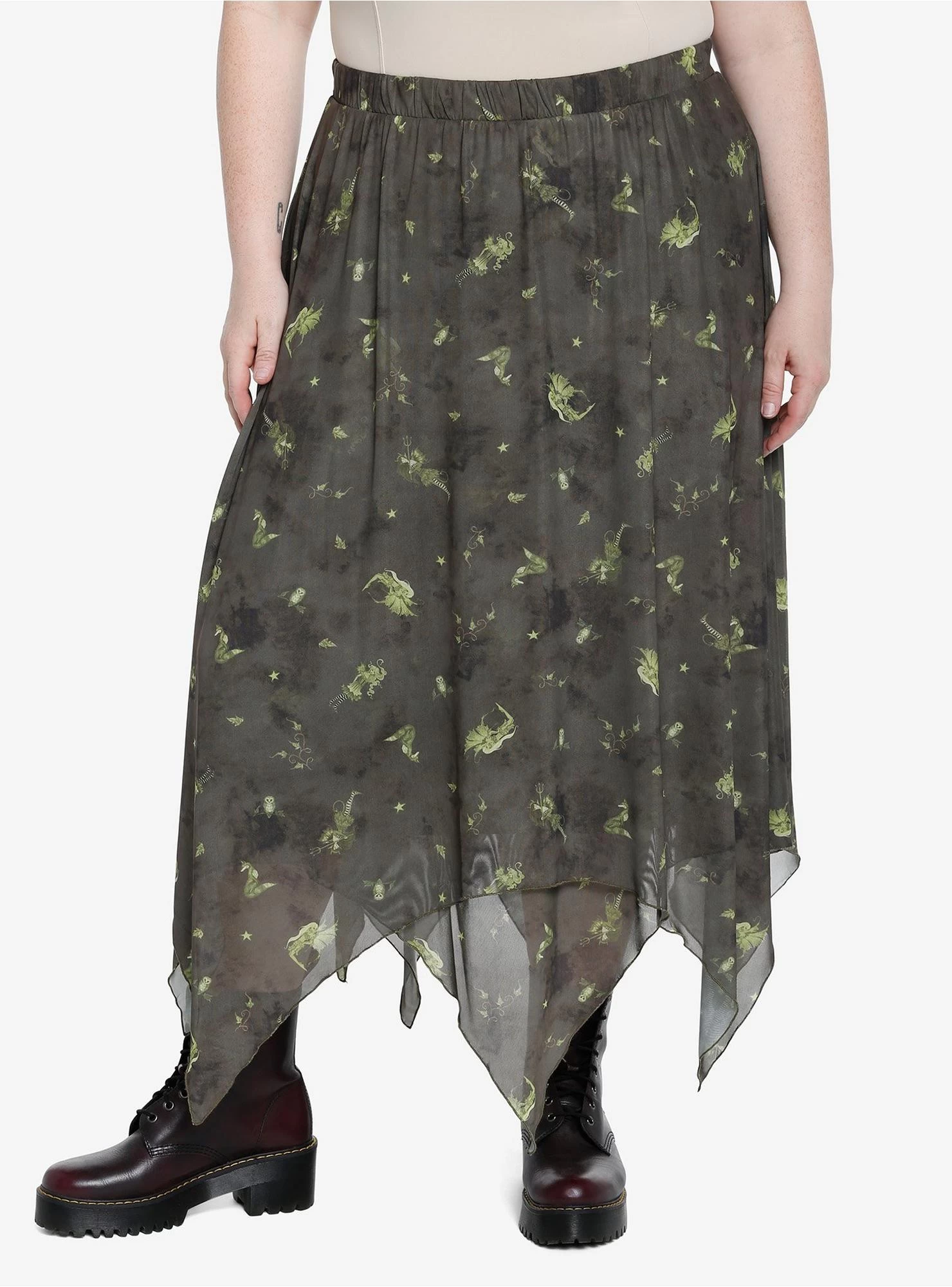 Channel your inner fairycore with this ethereal skirt! This deep green midi skirt features artwork from Amy Brown all over with a hanky hem and a stretchy waistband.